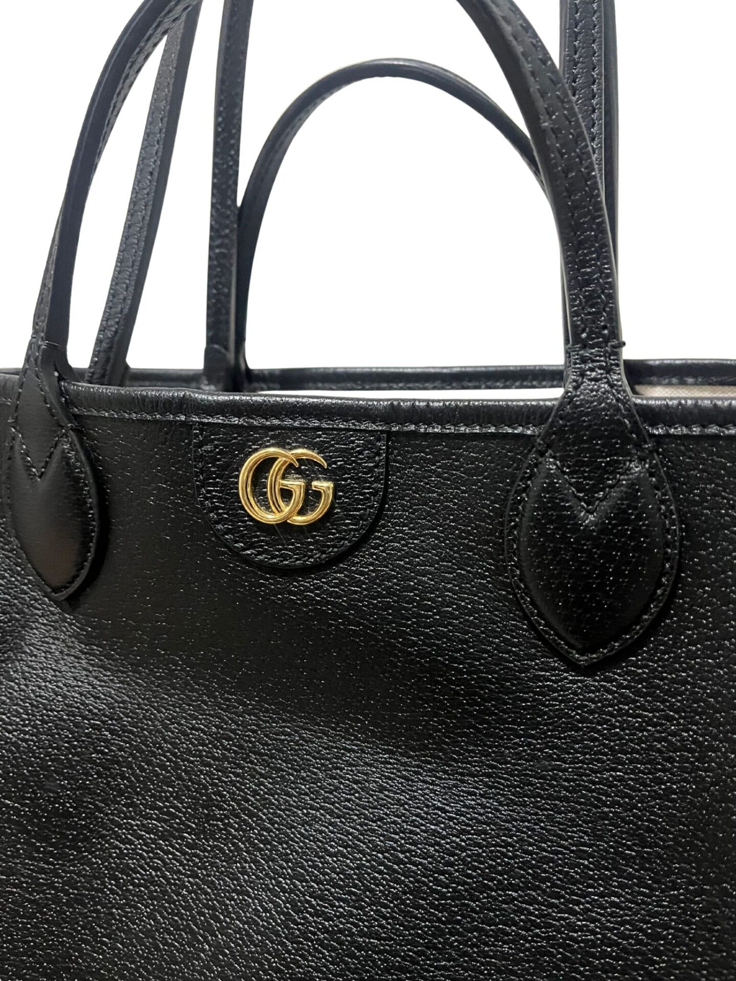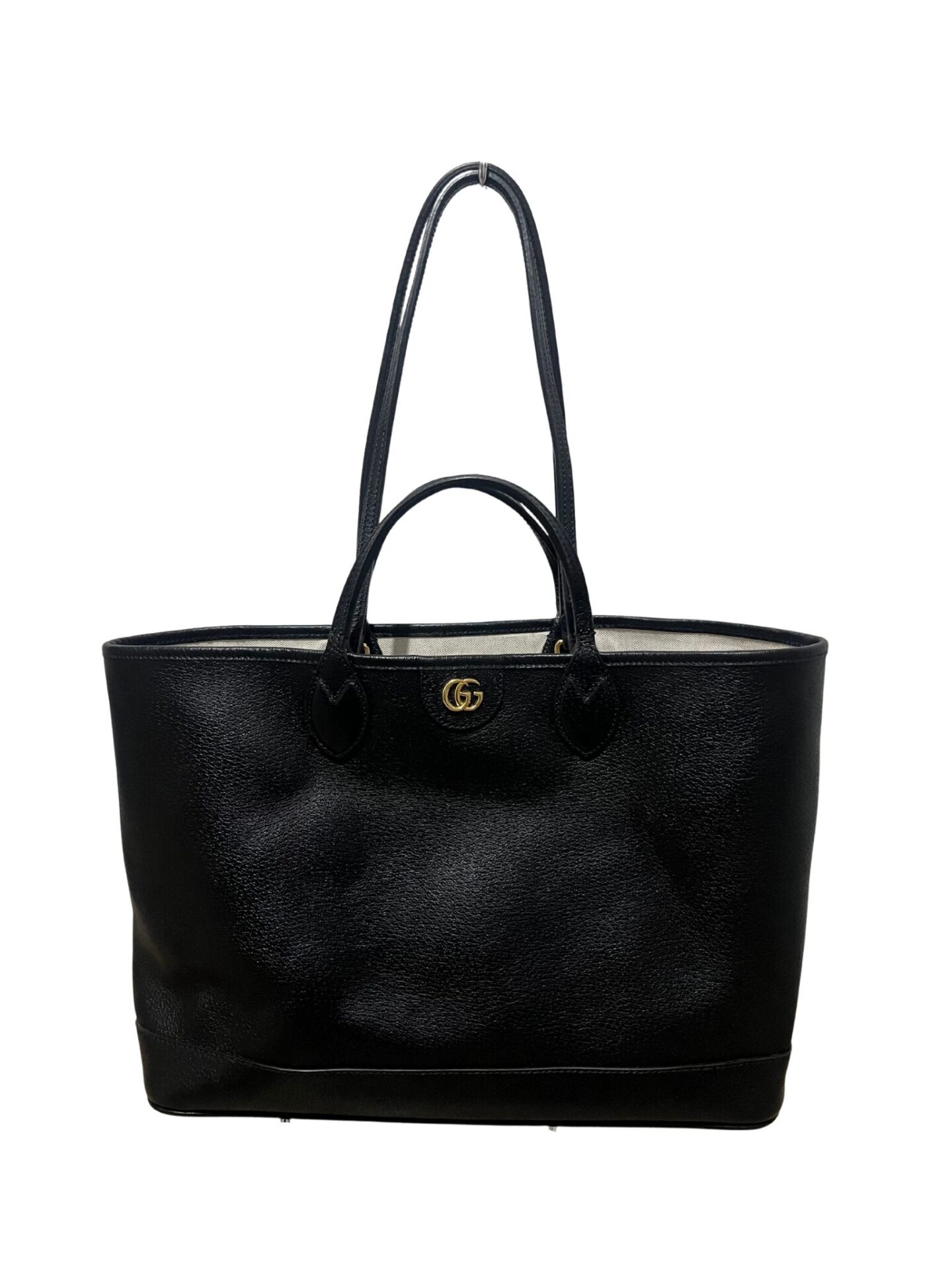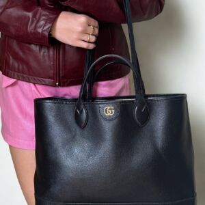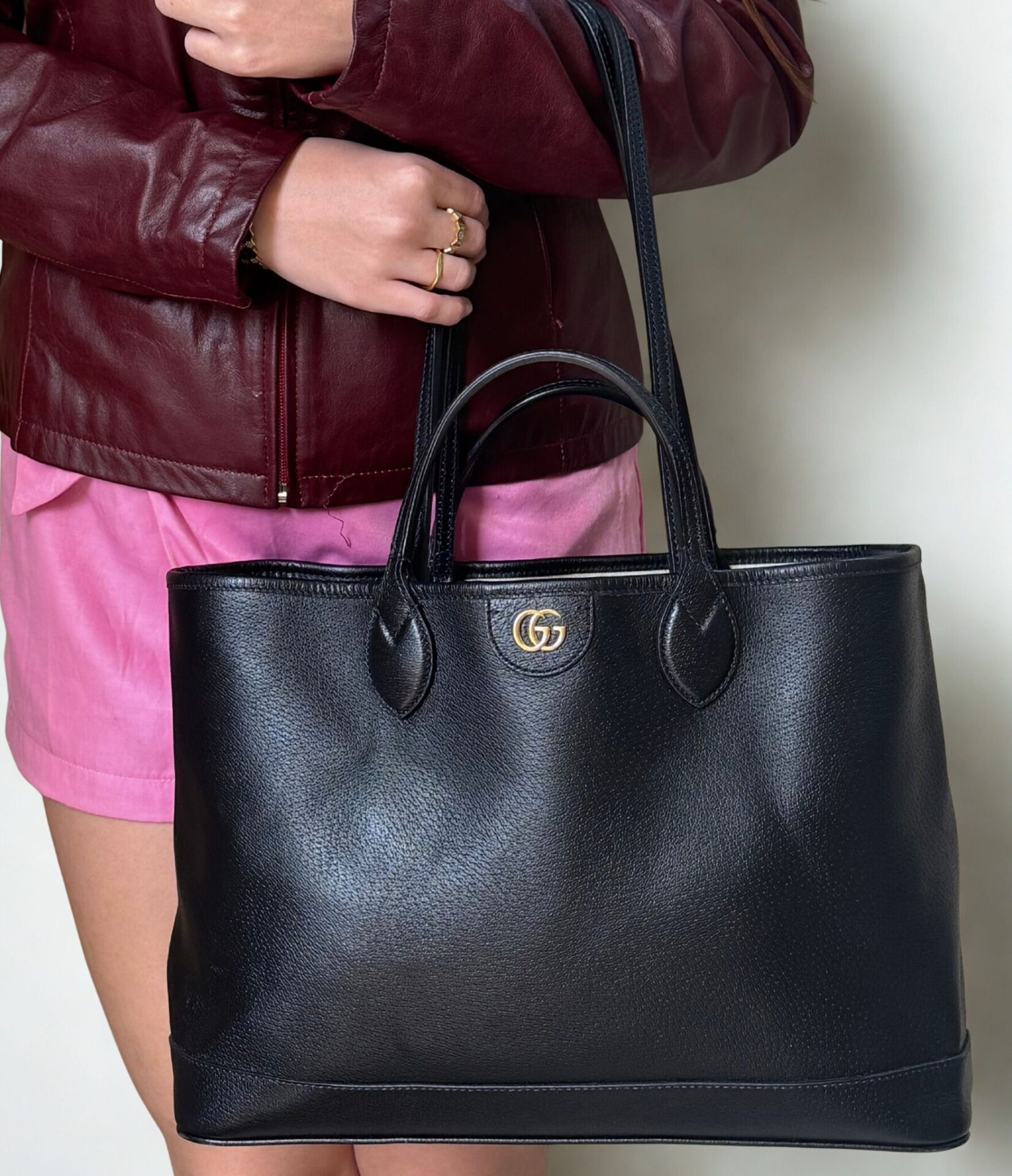Bolsa Gucci preta em tamanho grande com as ferragens douradas.