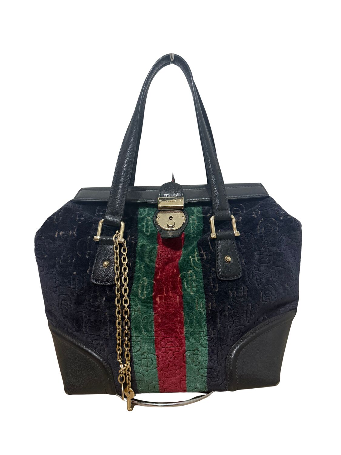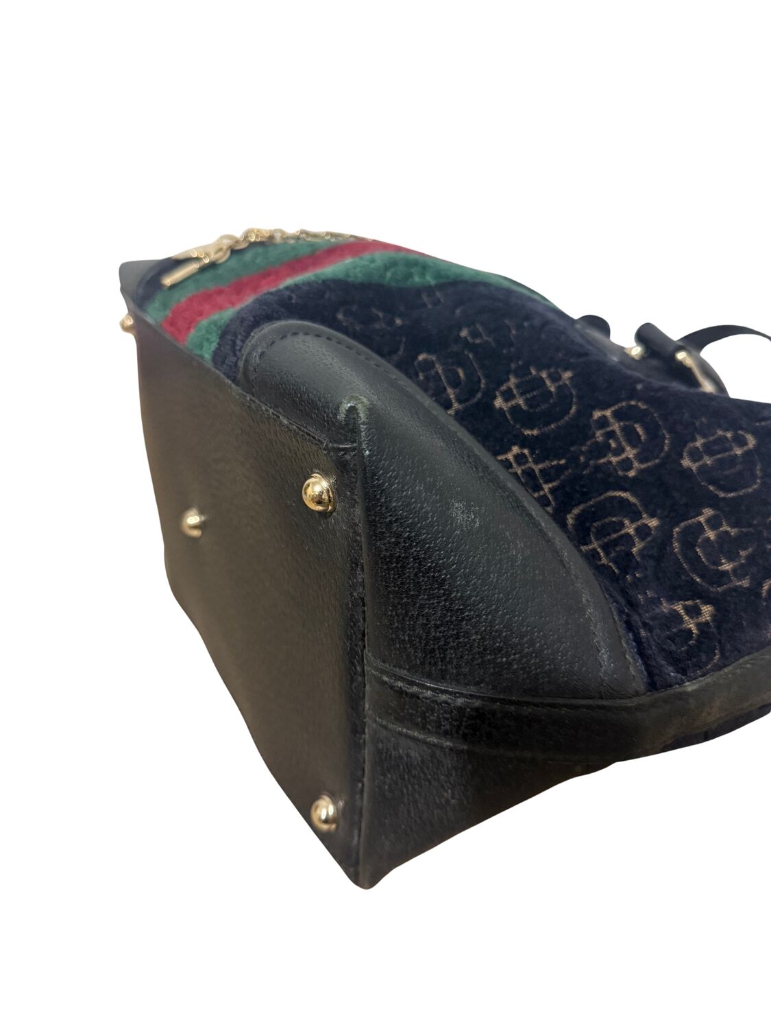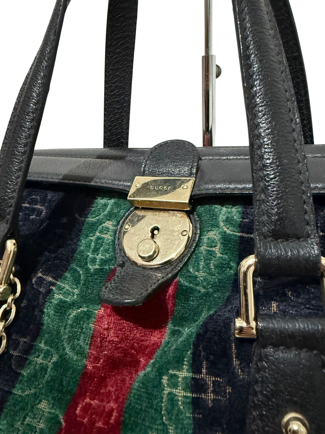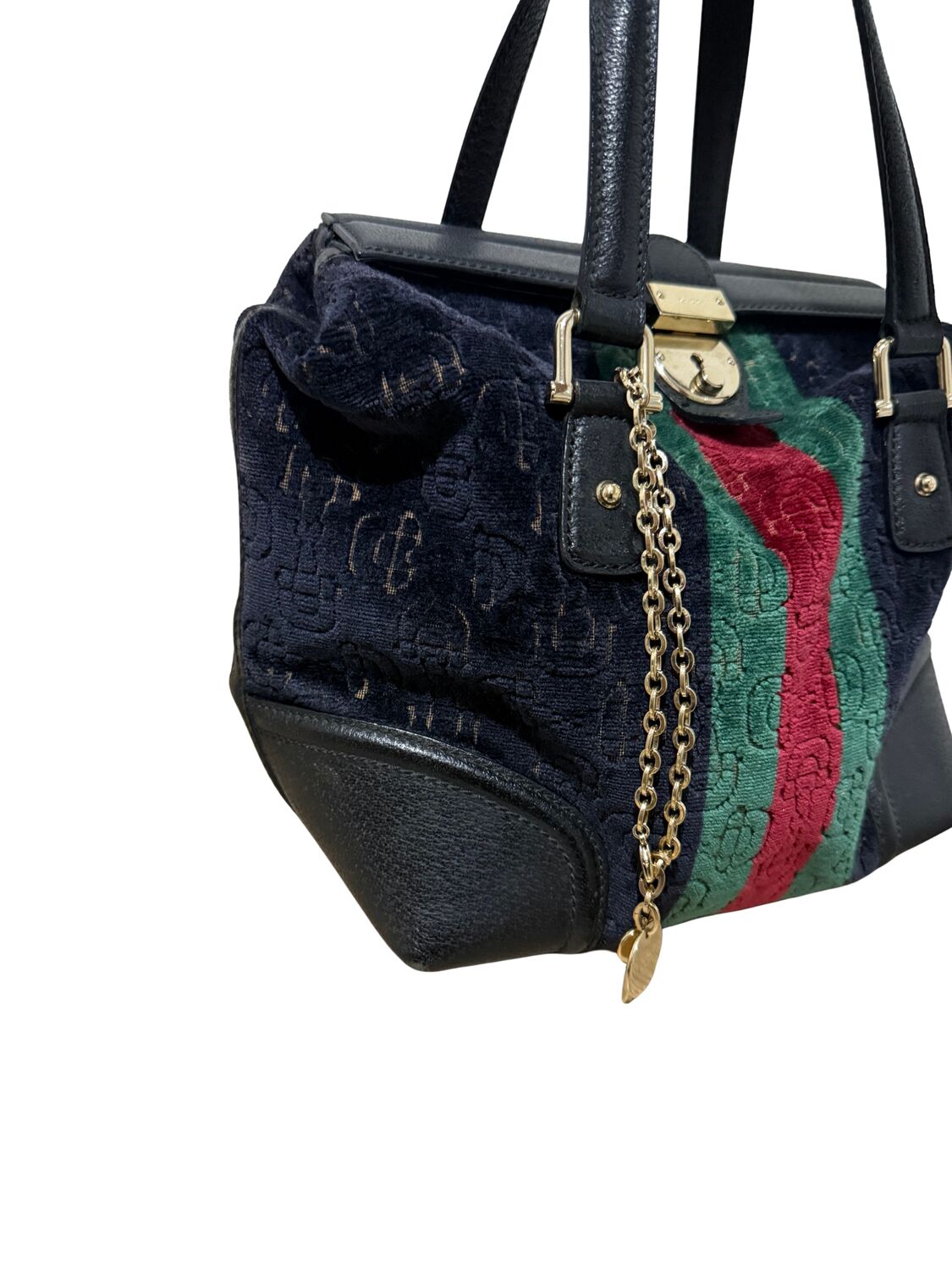 Bolsa Gucci vintage tote com logos horsebit em veludo e faixa web.