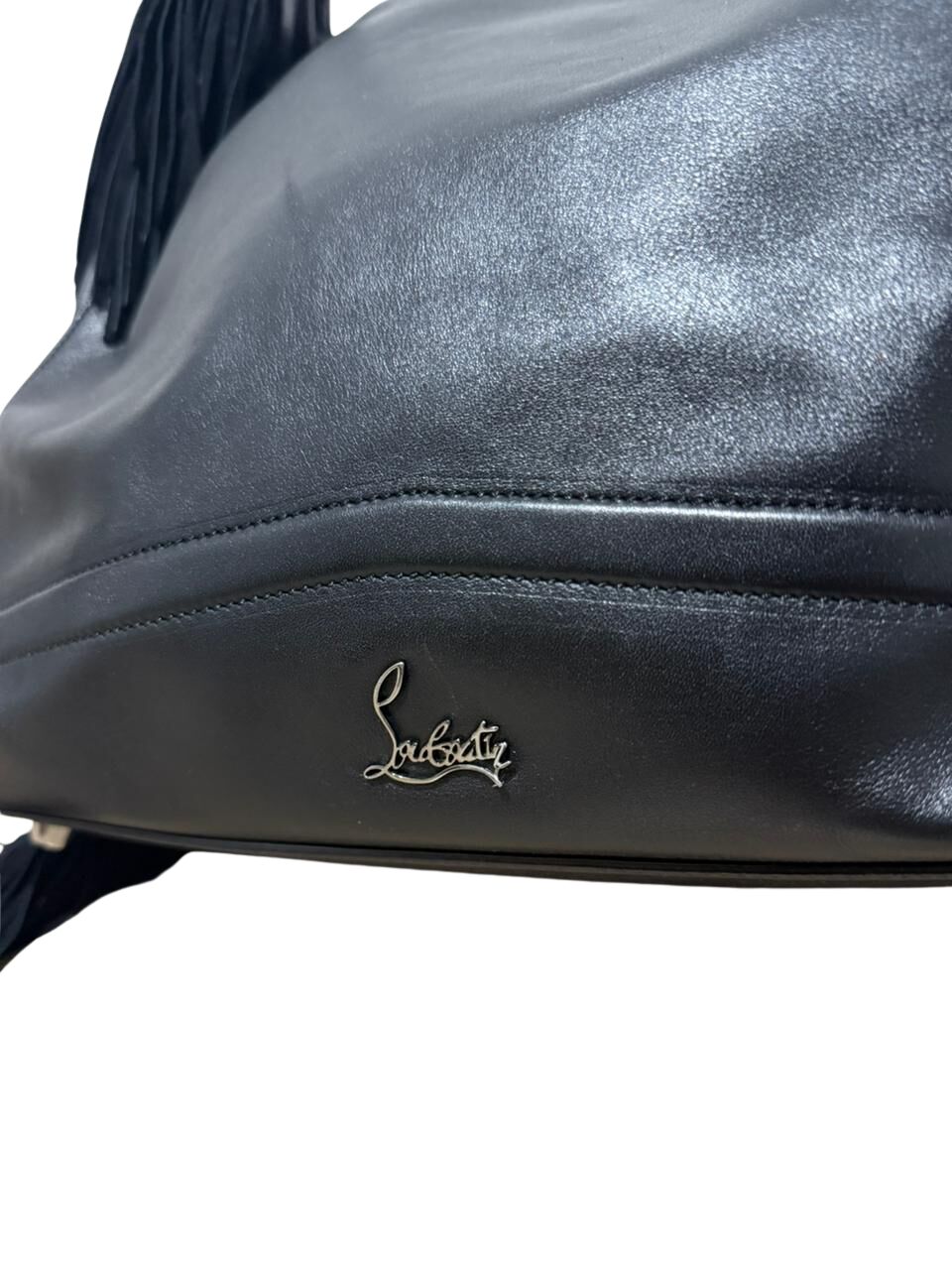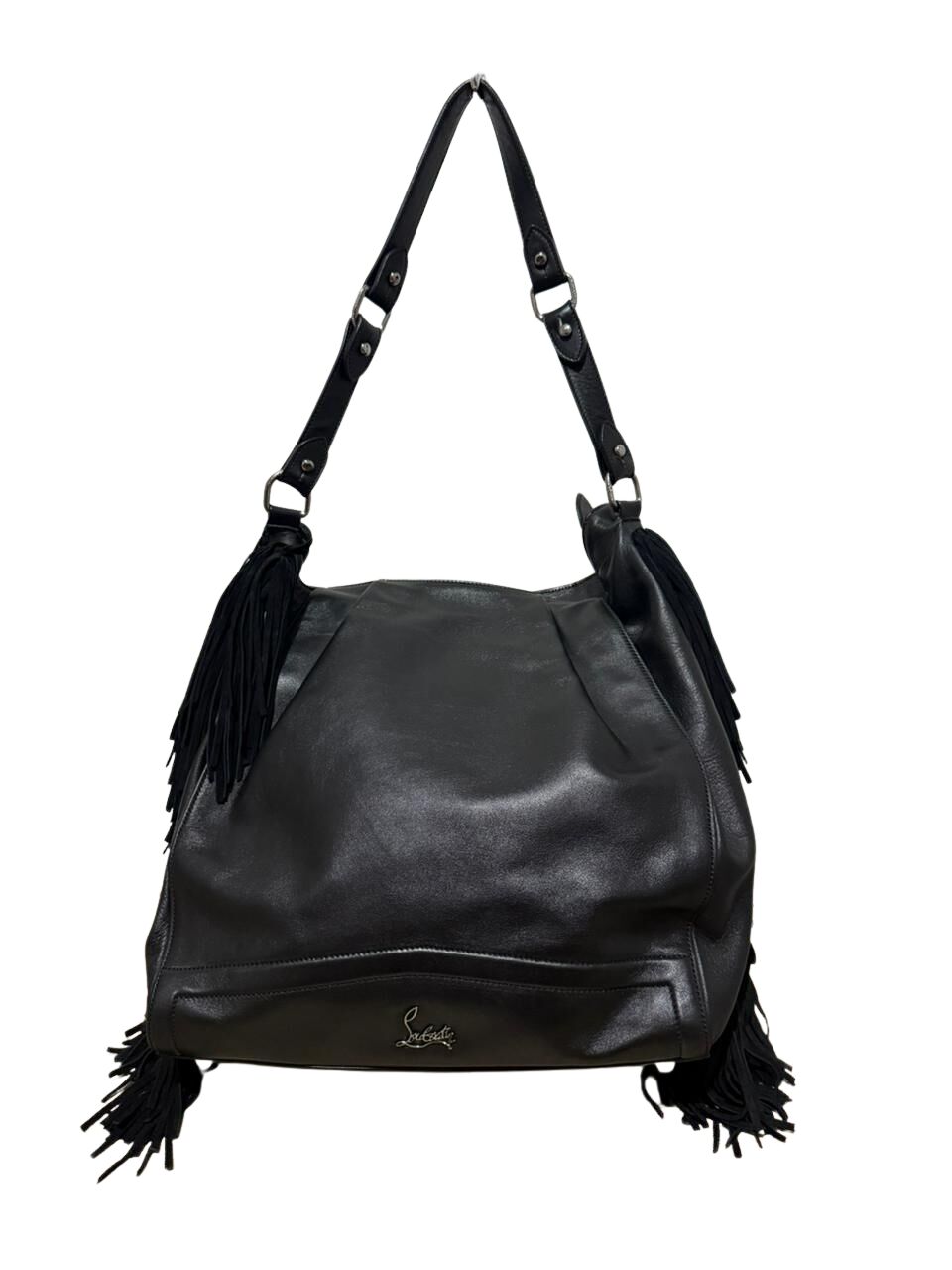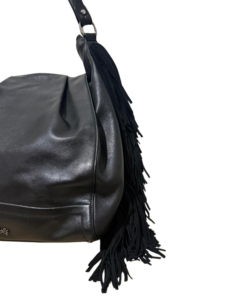 Bolsa Christian Louboutin em couro preto com logo frontal e franjas laterais.