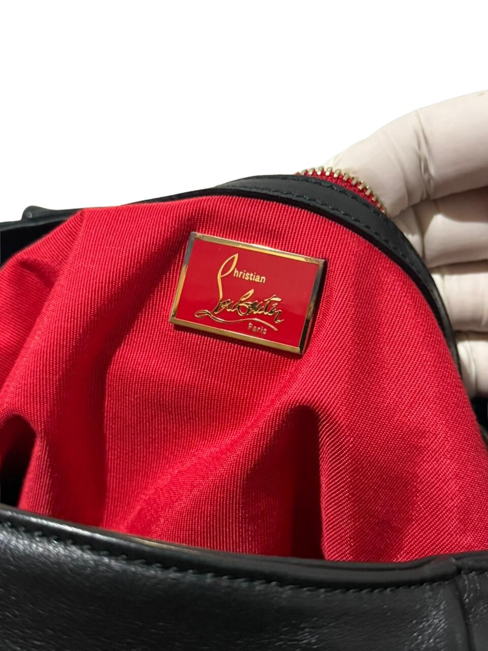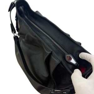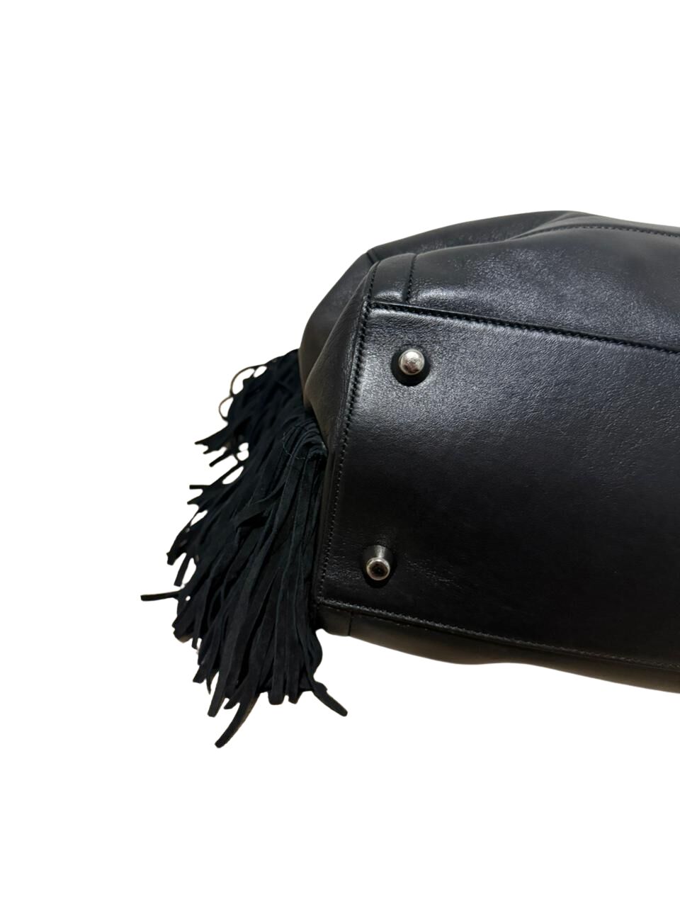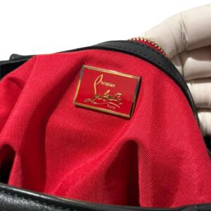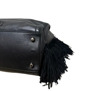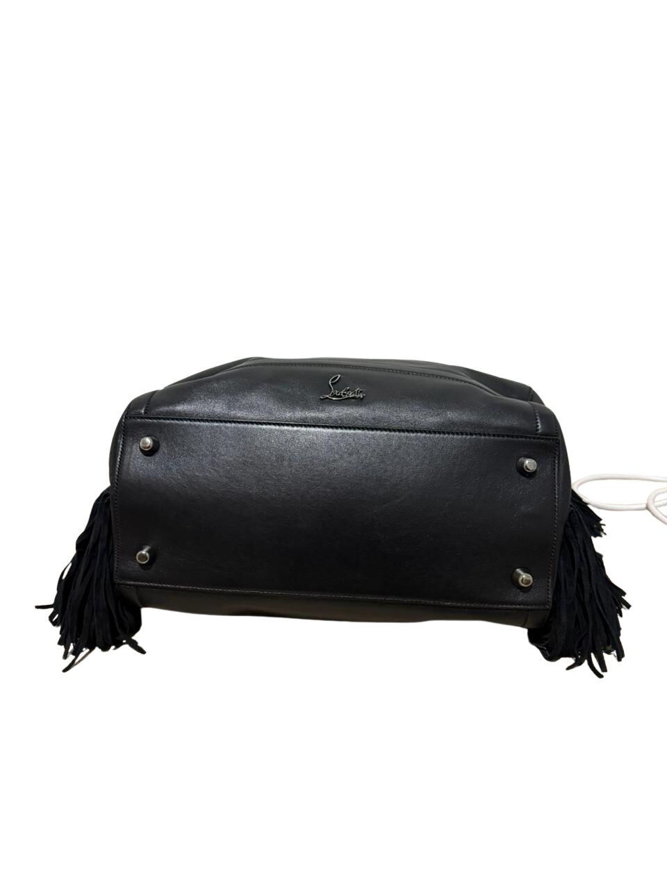 Bolsa Christian Louboutin em couro preto com logo frontal e franjas laterais.