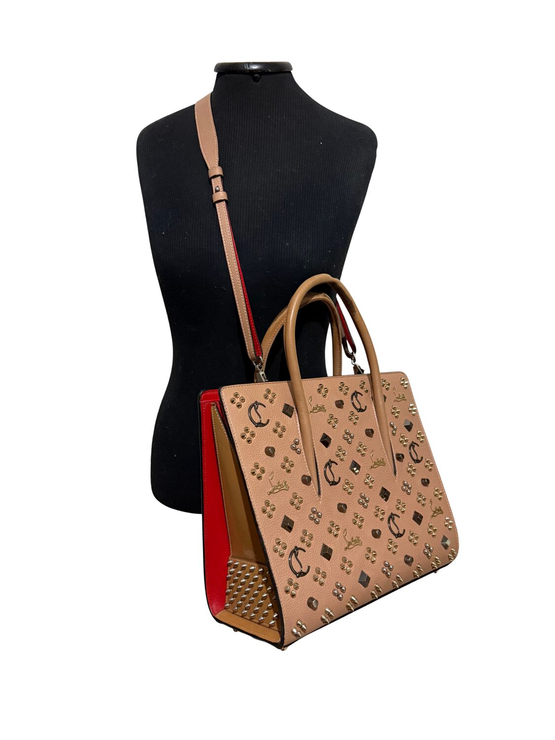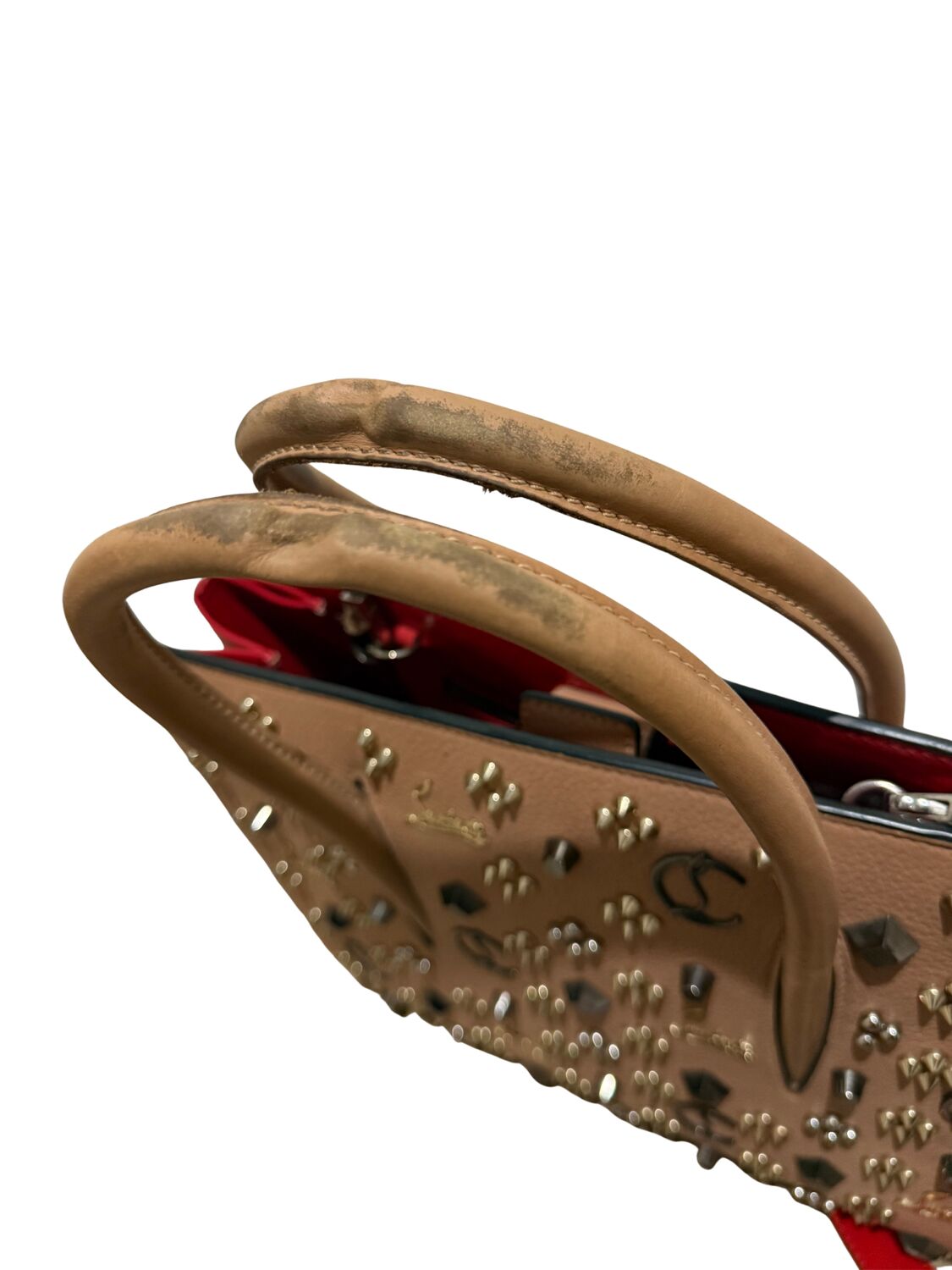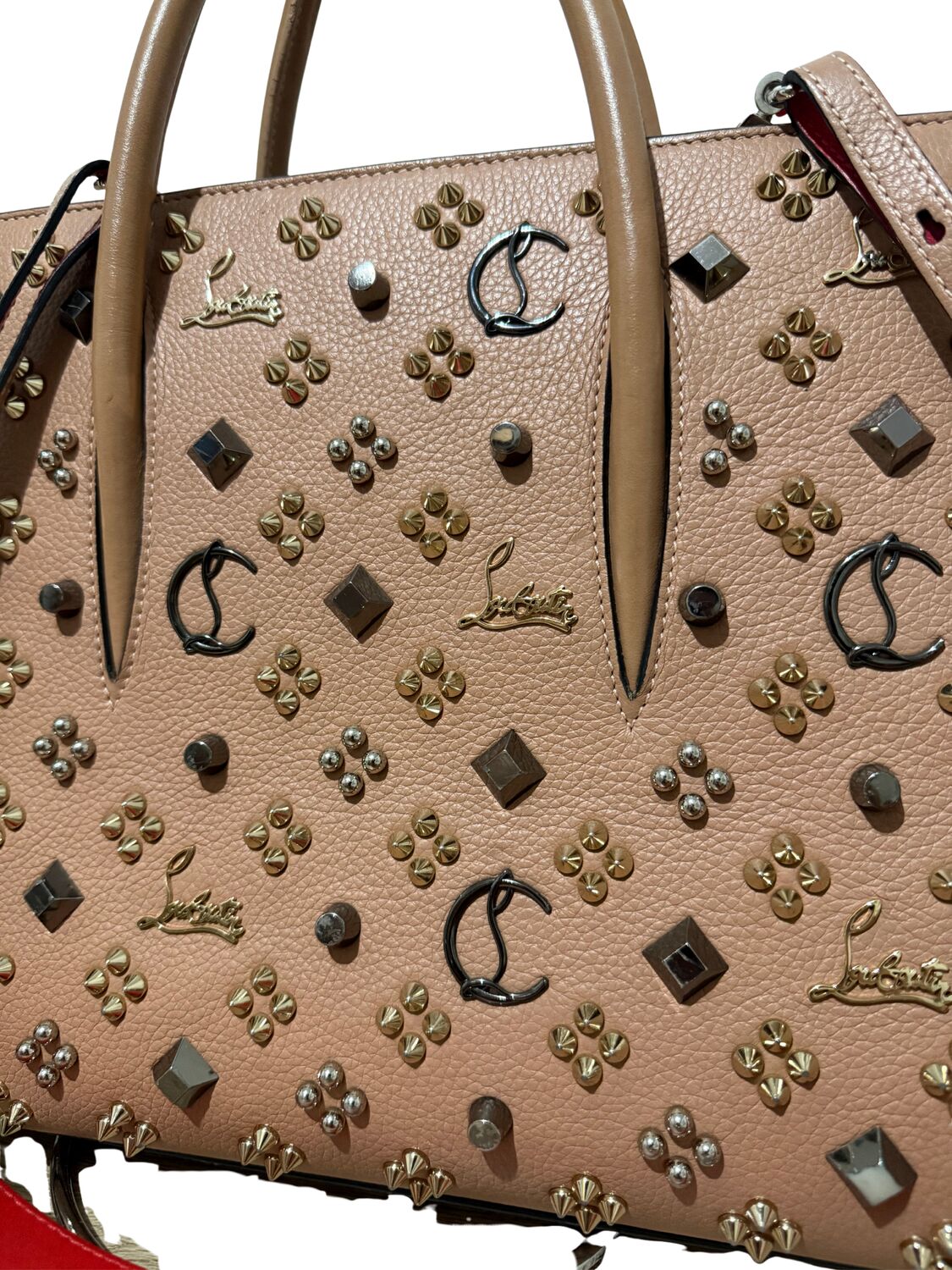 Bolsa Louboutin em couro com diversas aplicações.