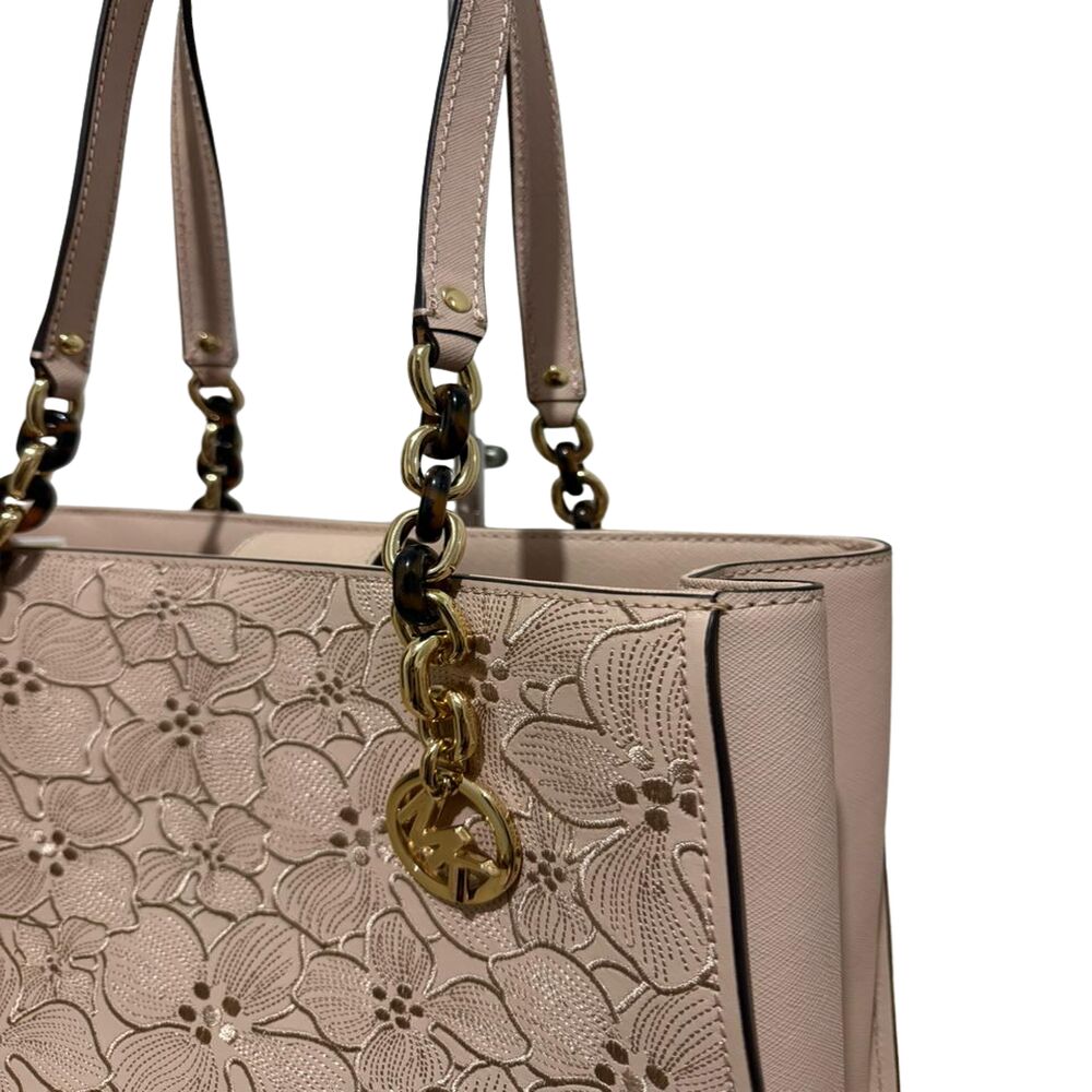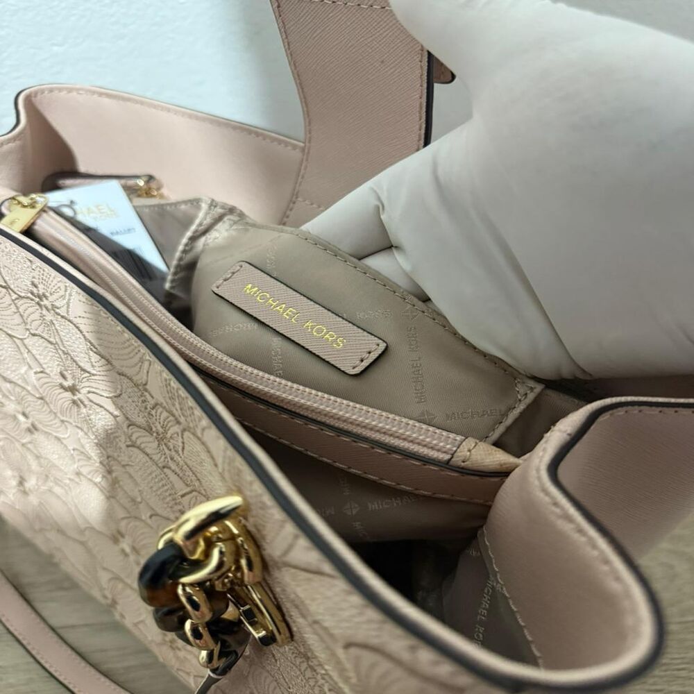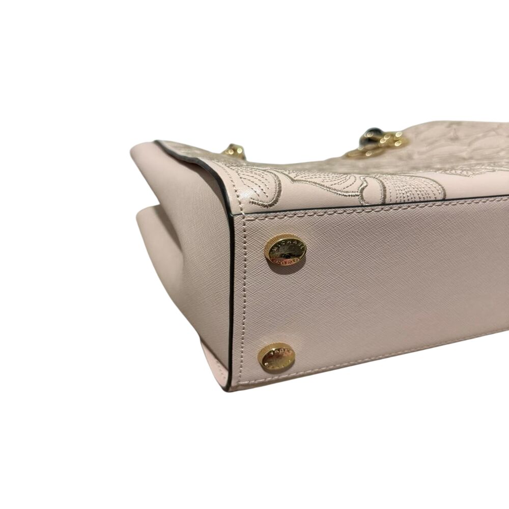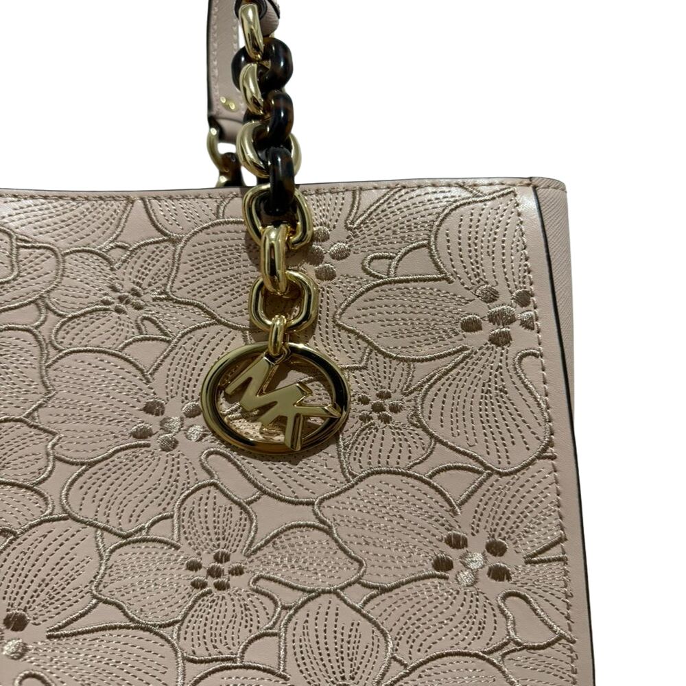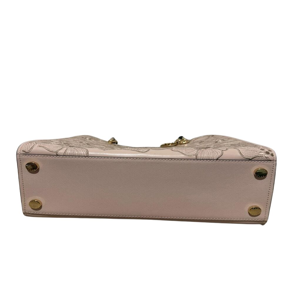 Bolsa Michael Kors em couro rosa com flores bordadas.