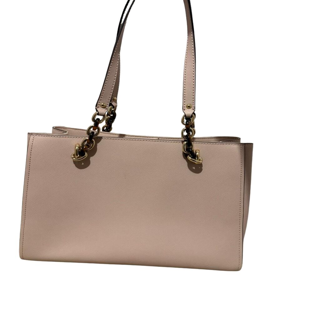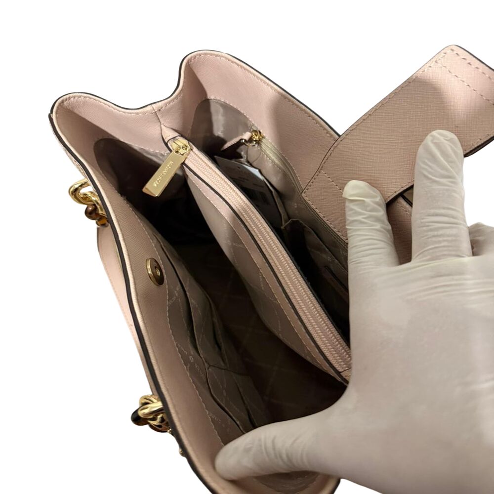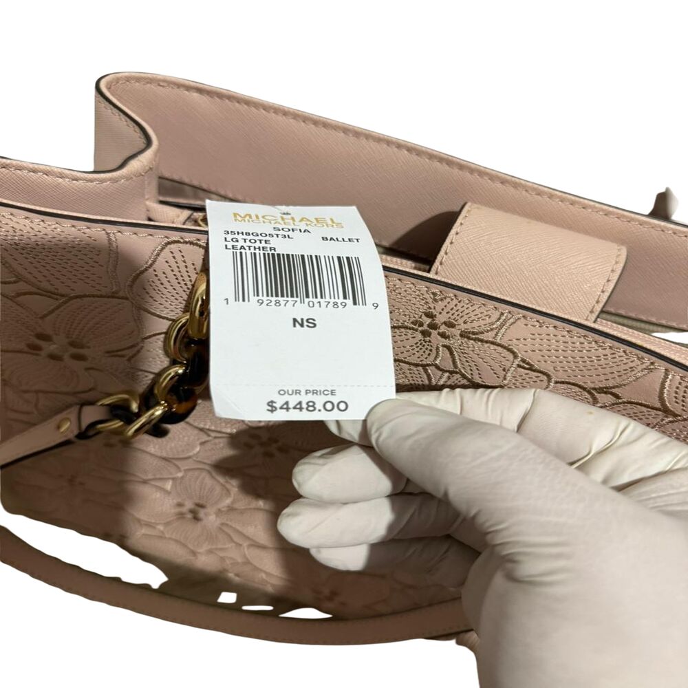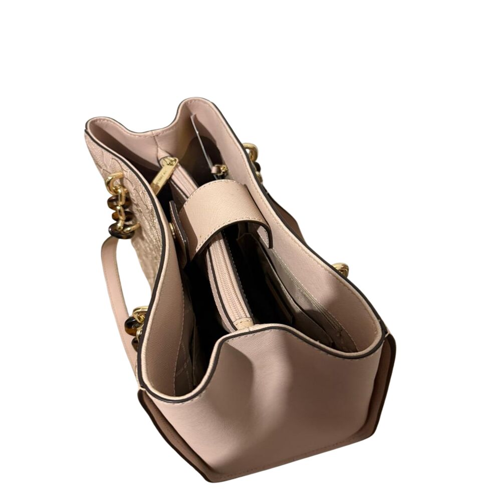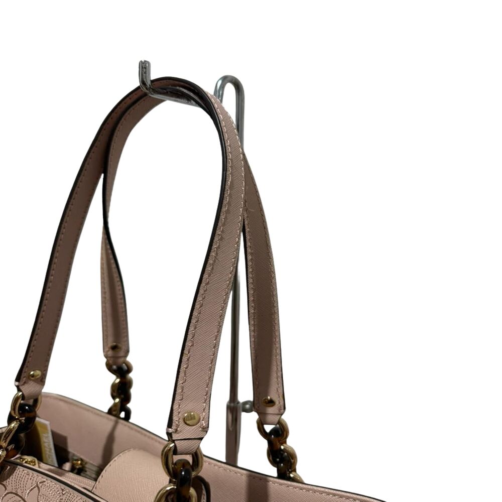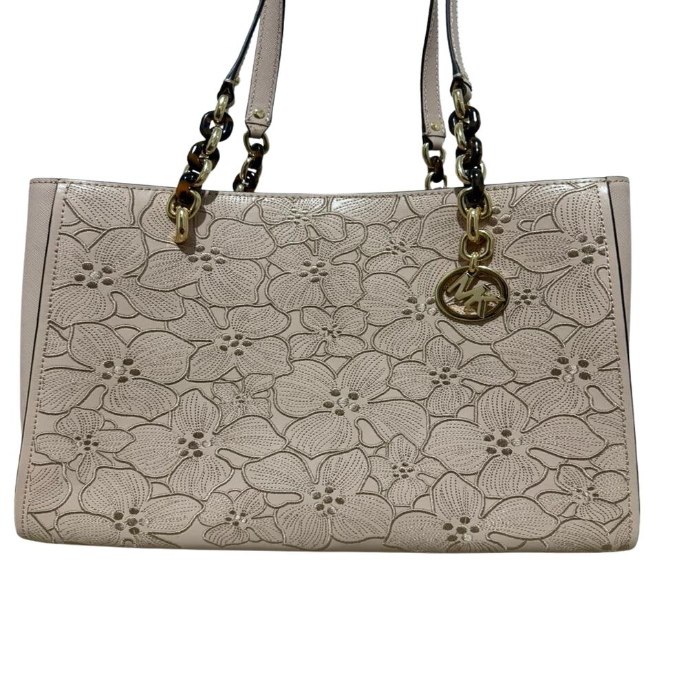 Bolsa Michael Kors em couro rosa com flores bordadas.