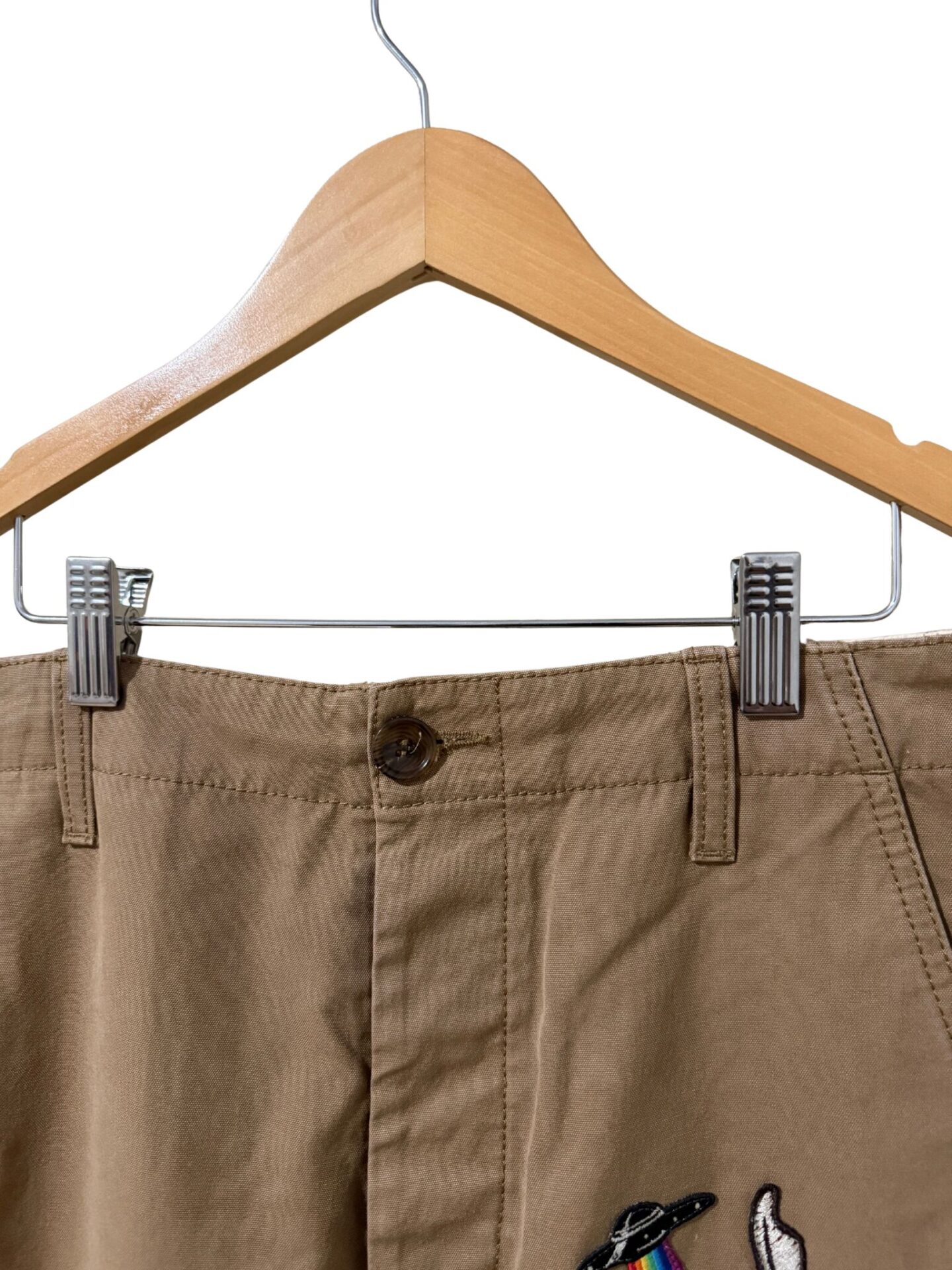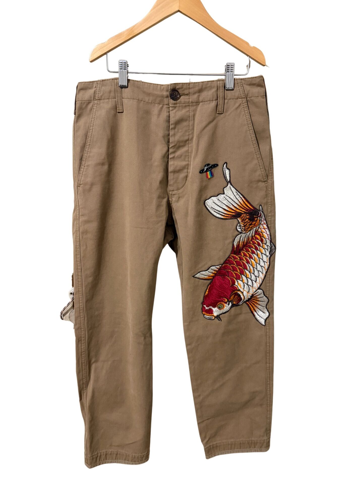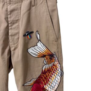 Calça Gucci unissex de sarja marrom com patches coloridos.