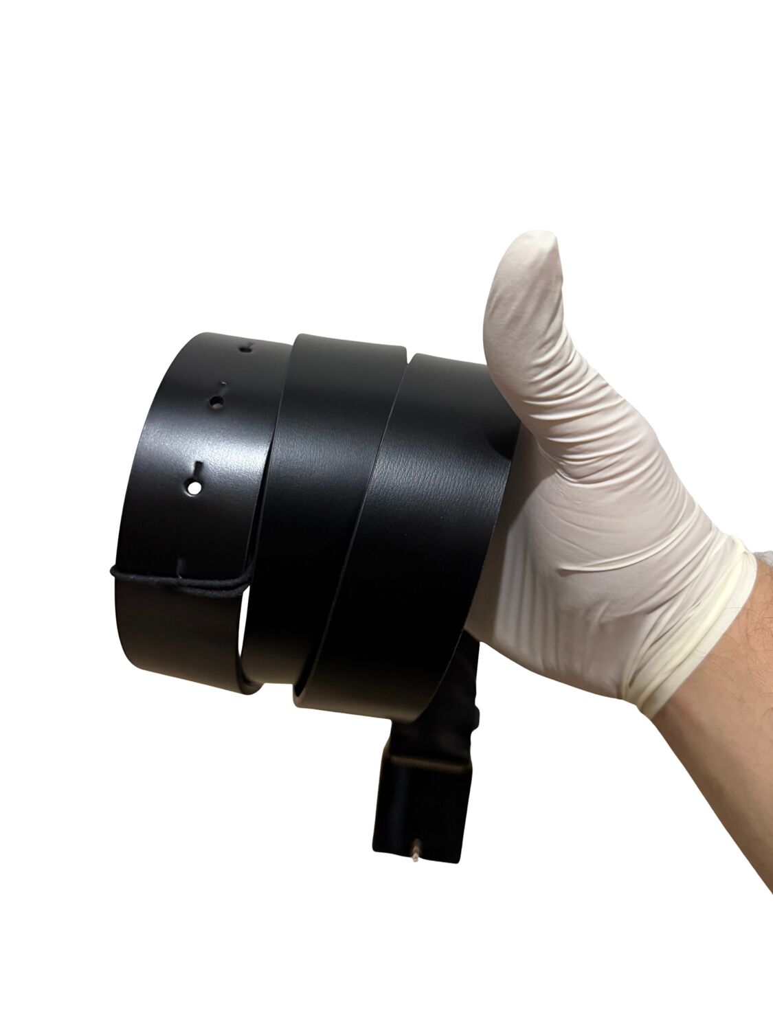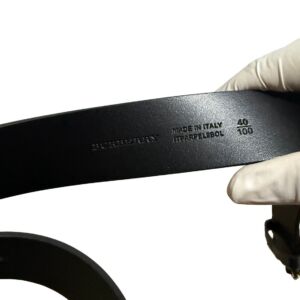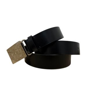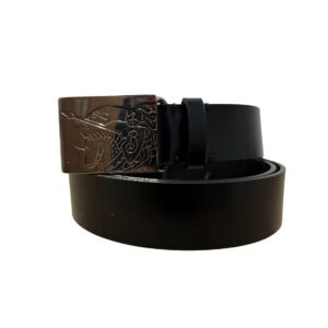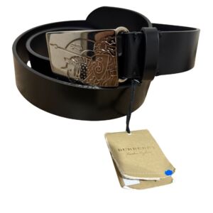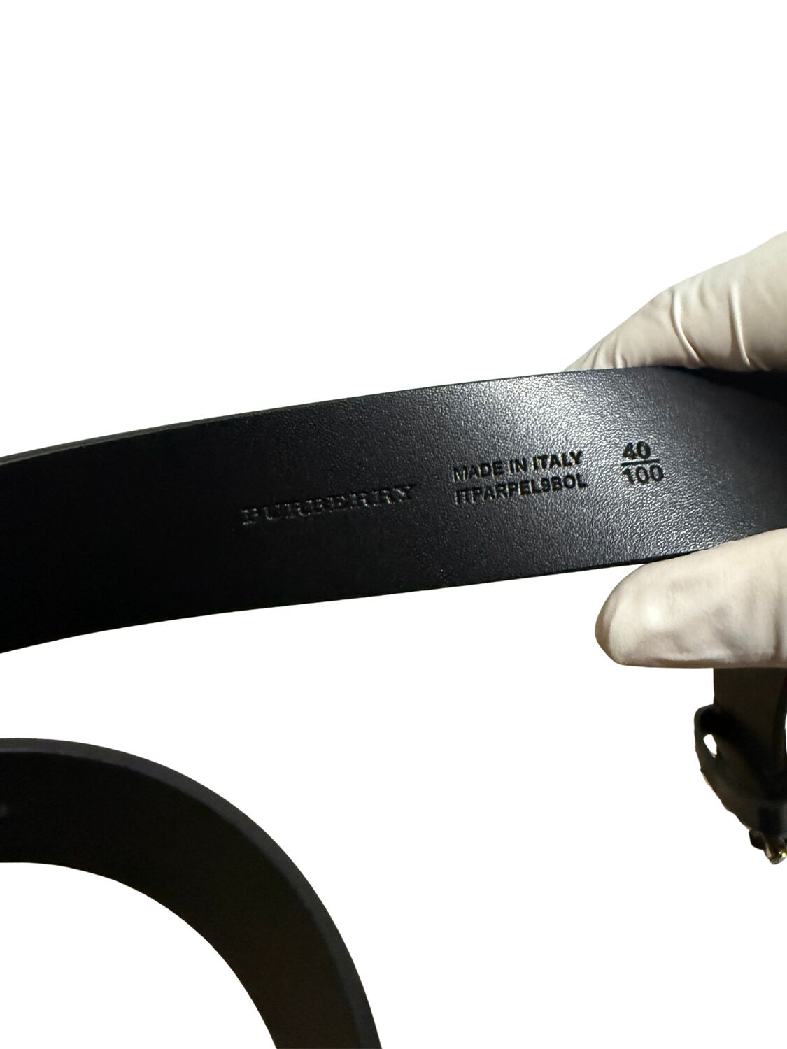 Cinto Burberry de couro preto e ferragem prateada com a logo.
