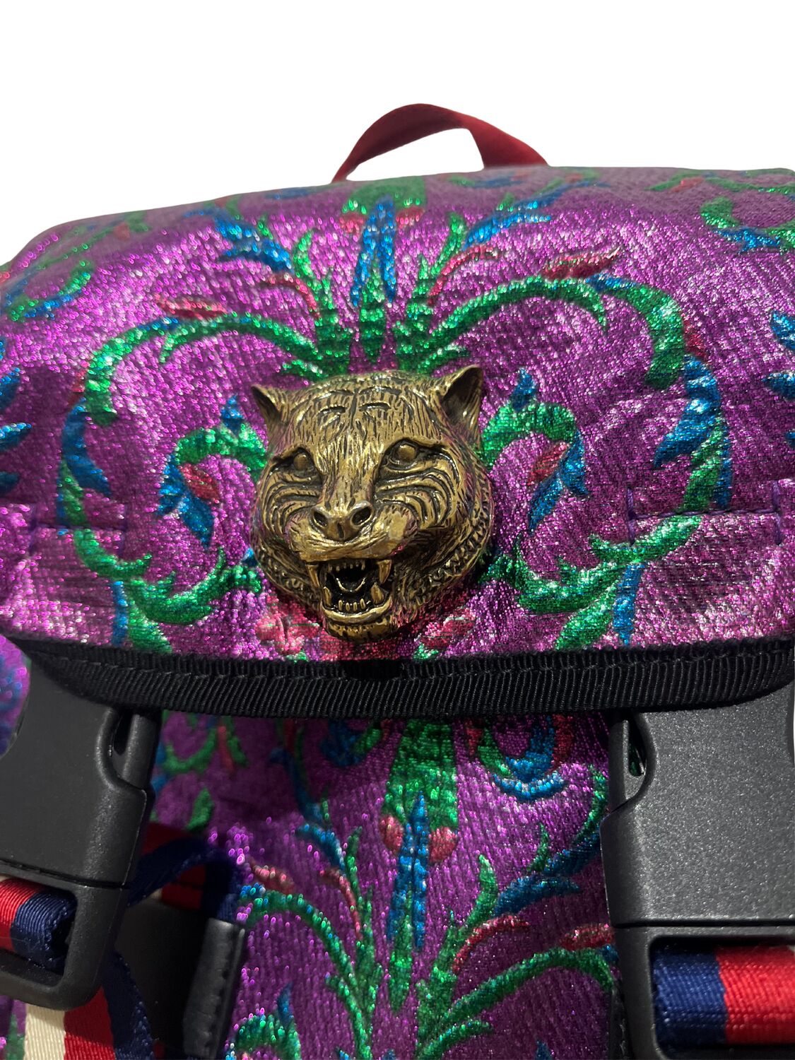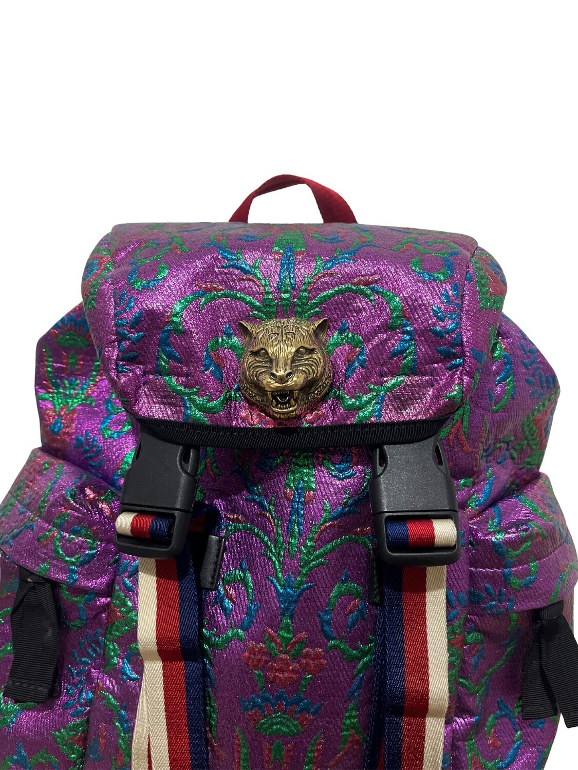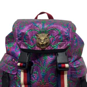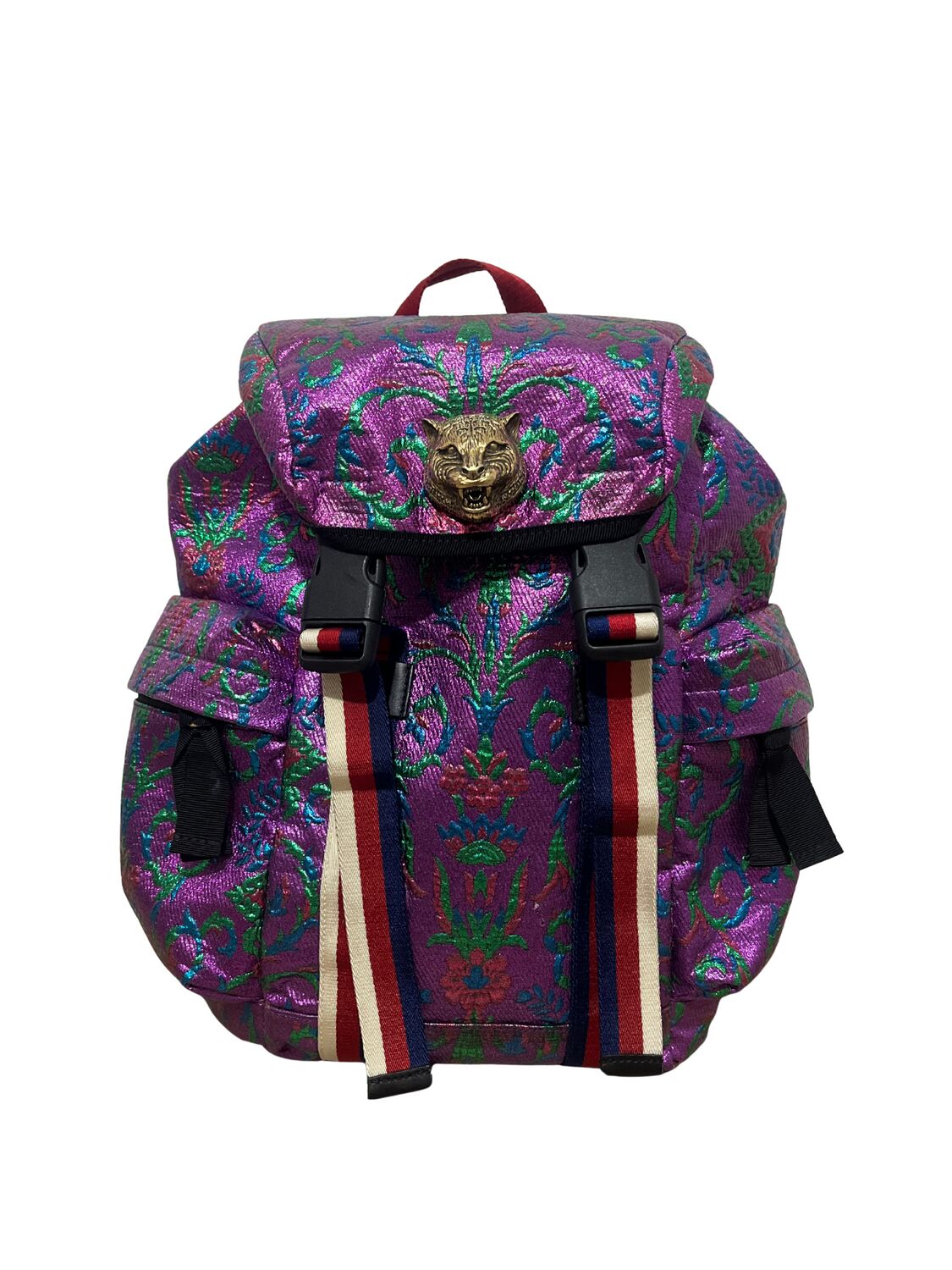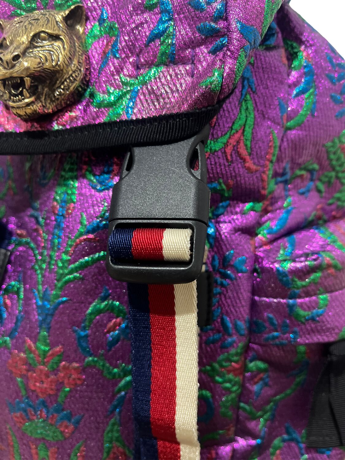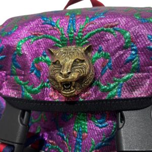Mochila Gucci em tecido psicodélico com o tigre na aba principal.