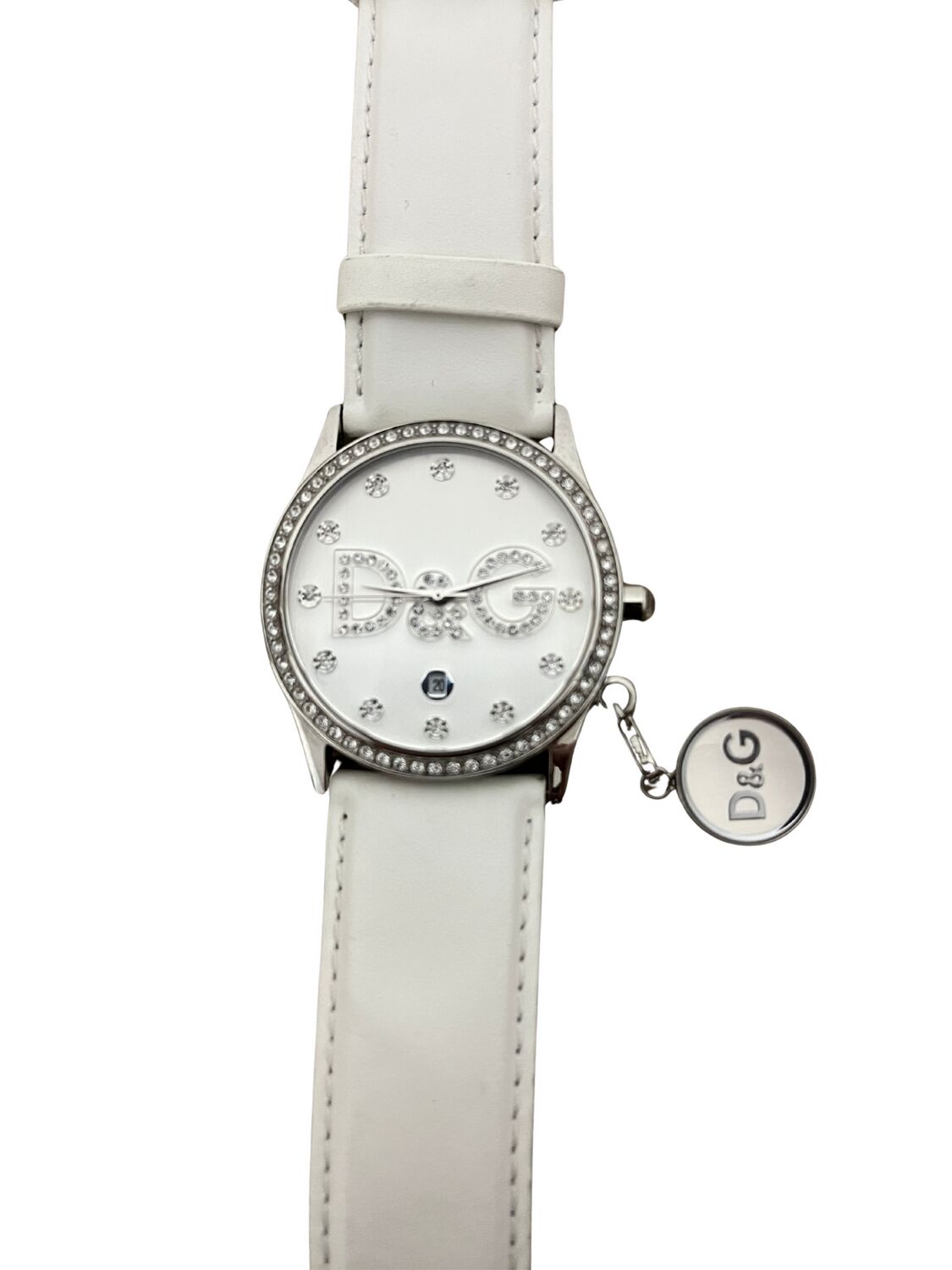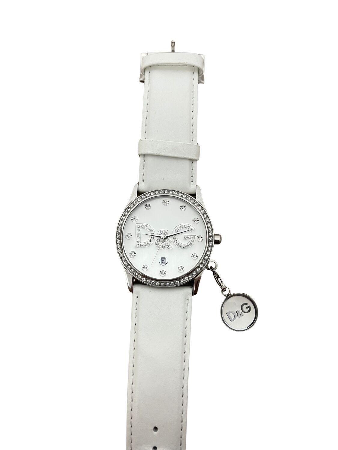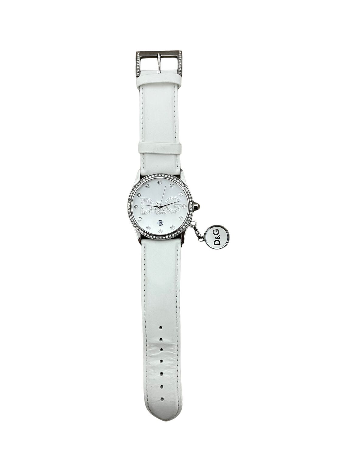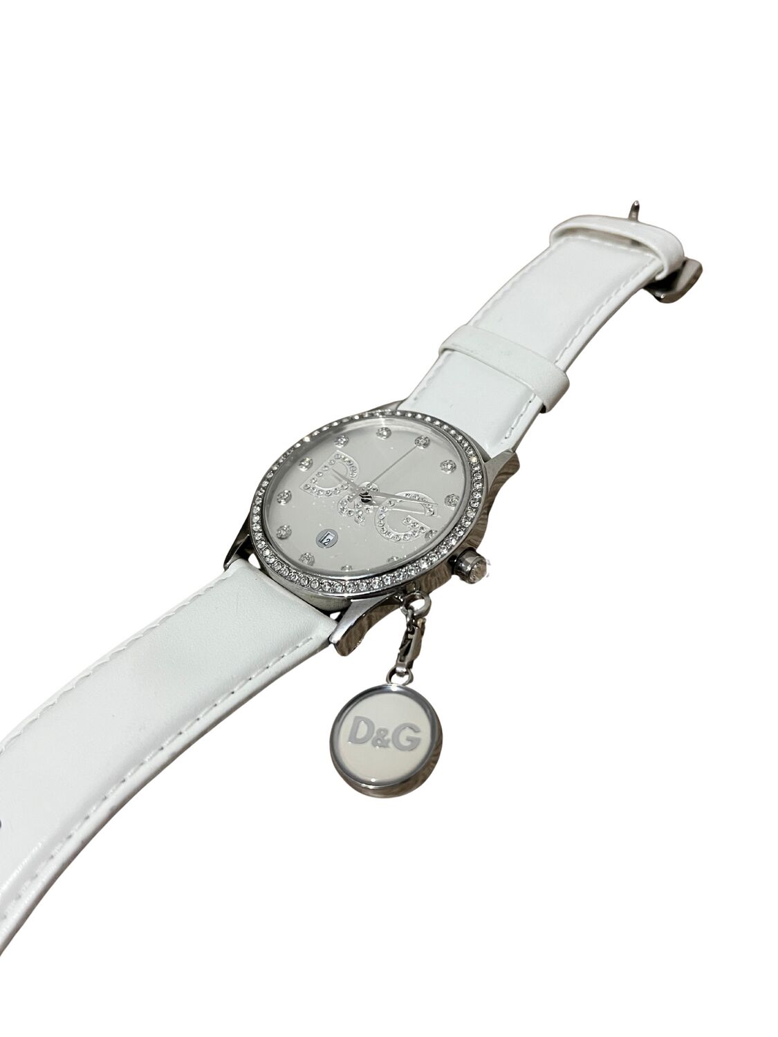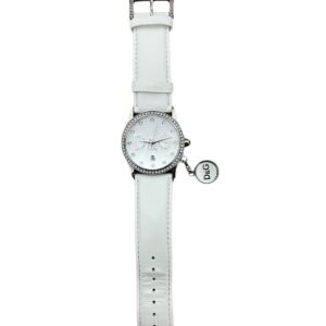 Relógio Dolce & Gabbana com pulseira em couro branca e visor cravejado com pingente.