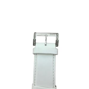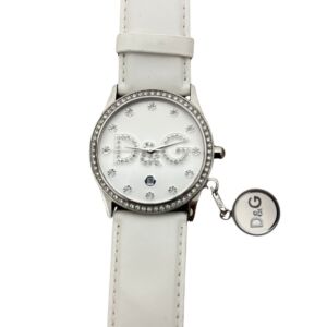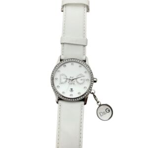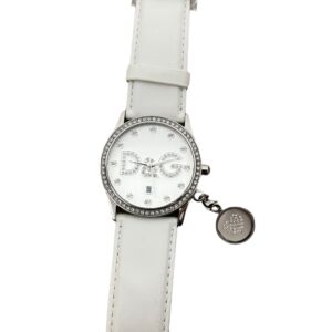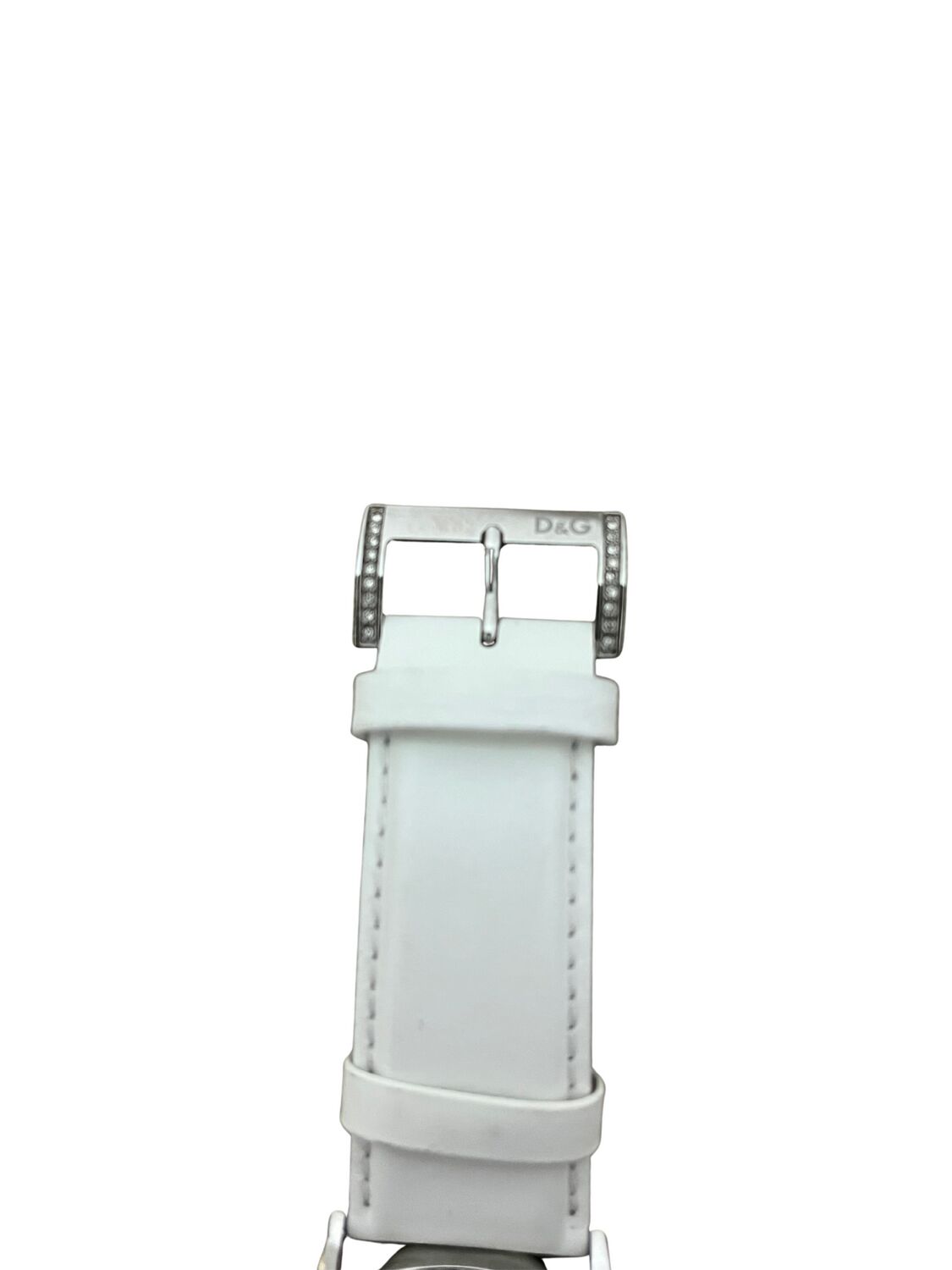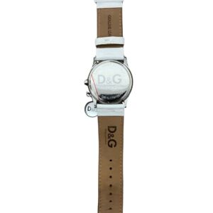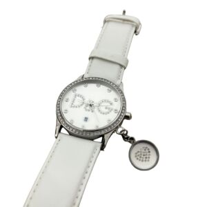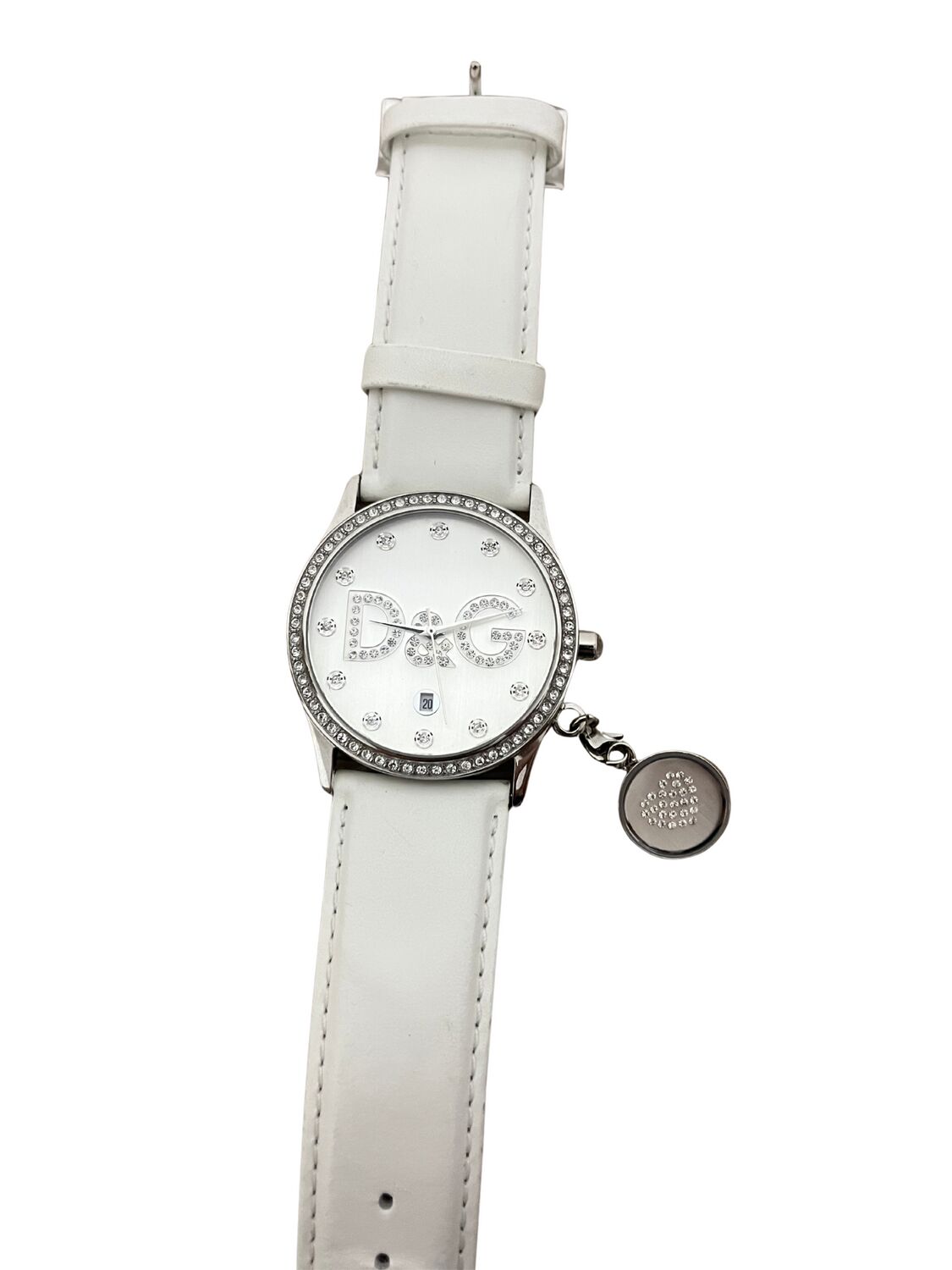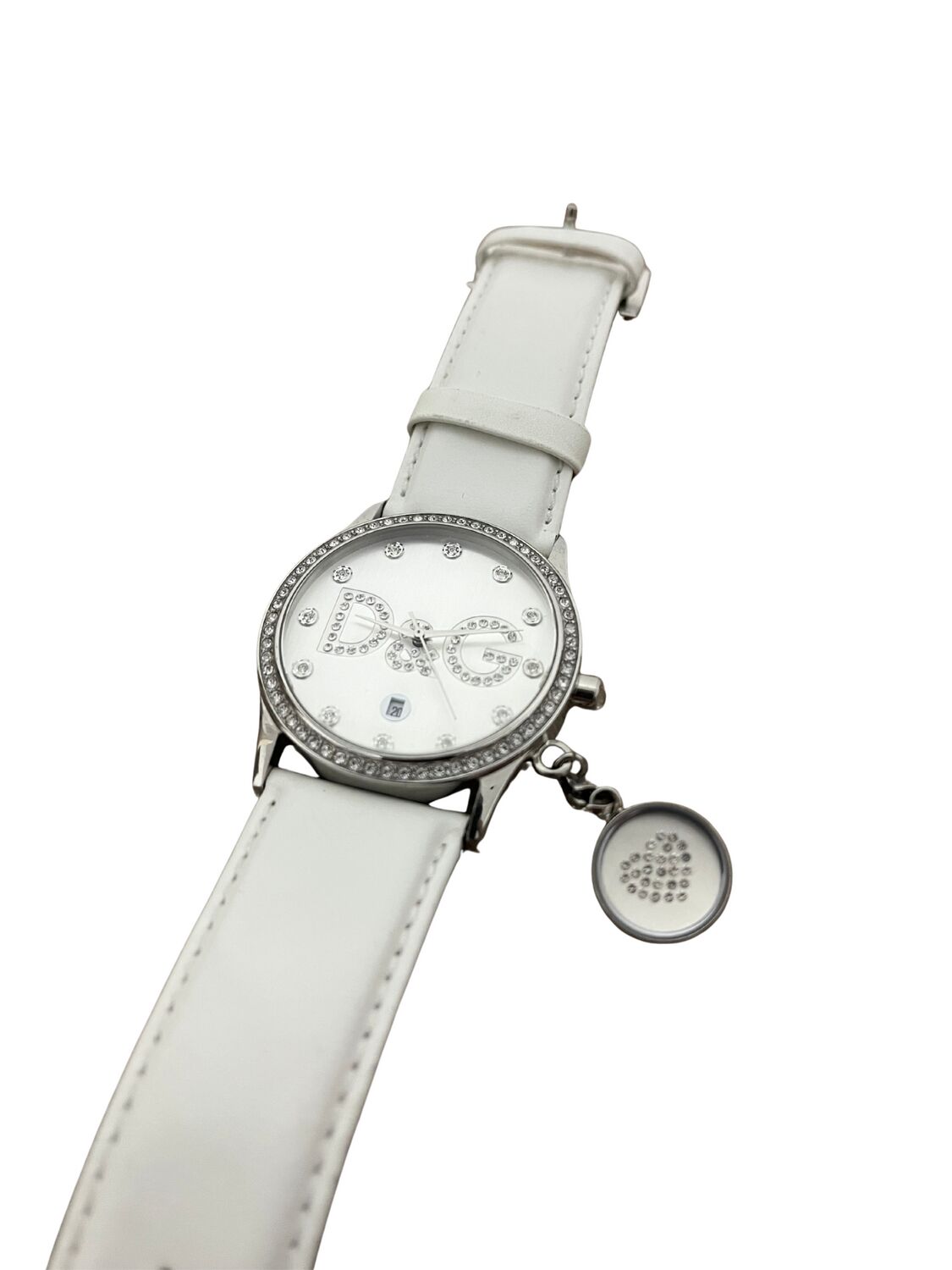 Relógio Dolce & Gabbana com pulseira em couro branca e visor cravejado com pingente.