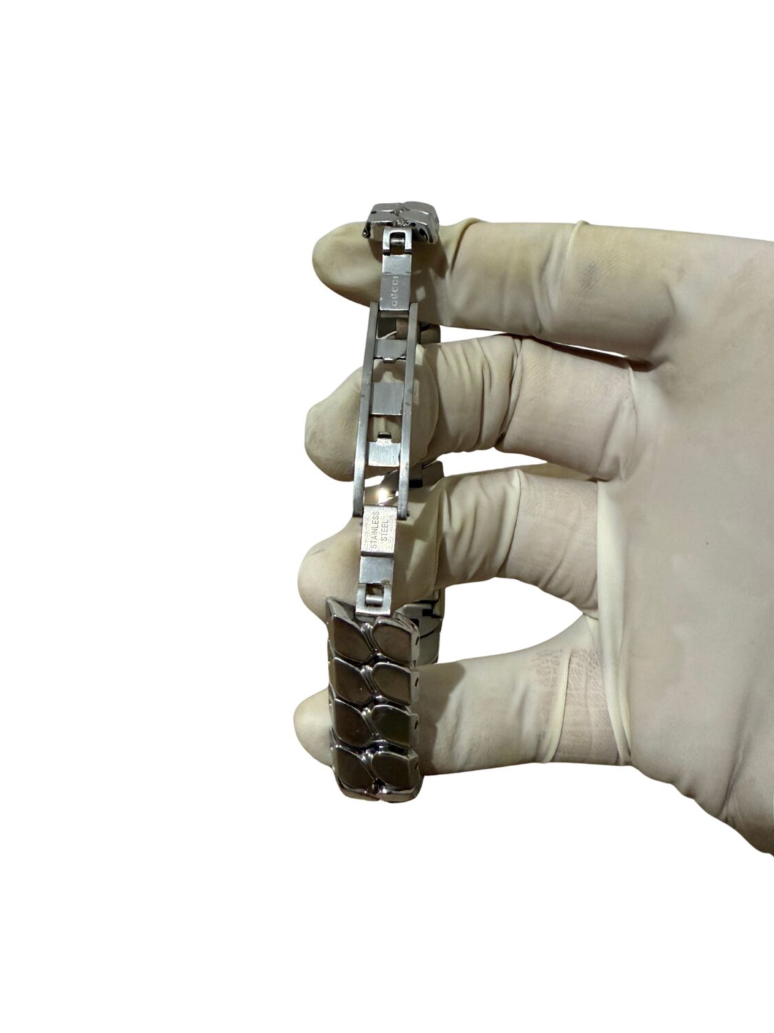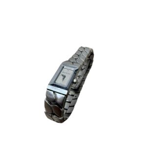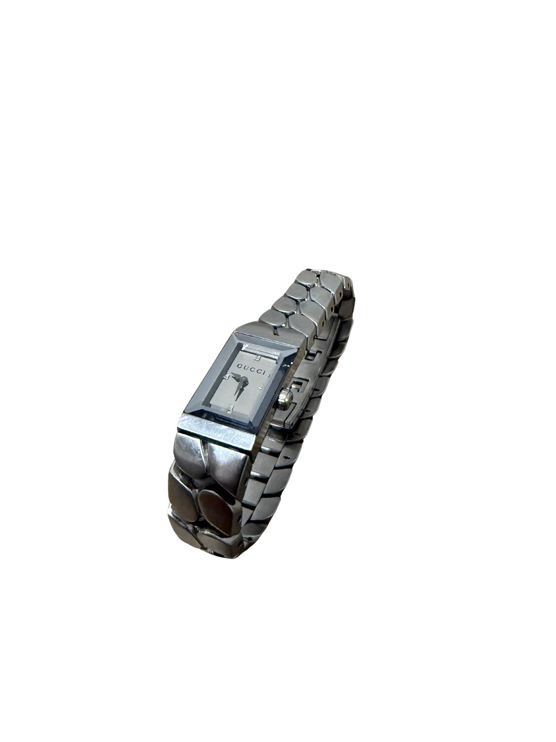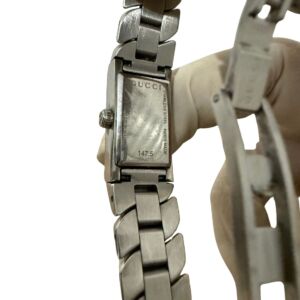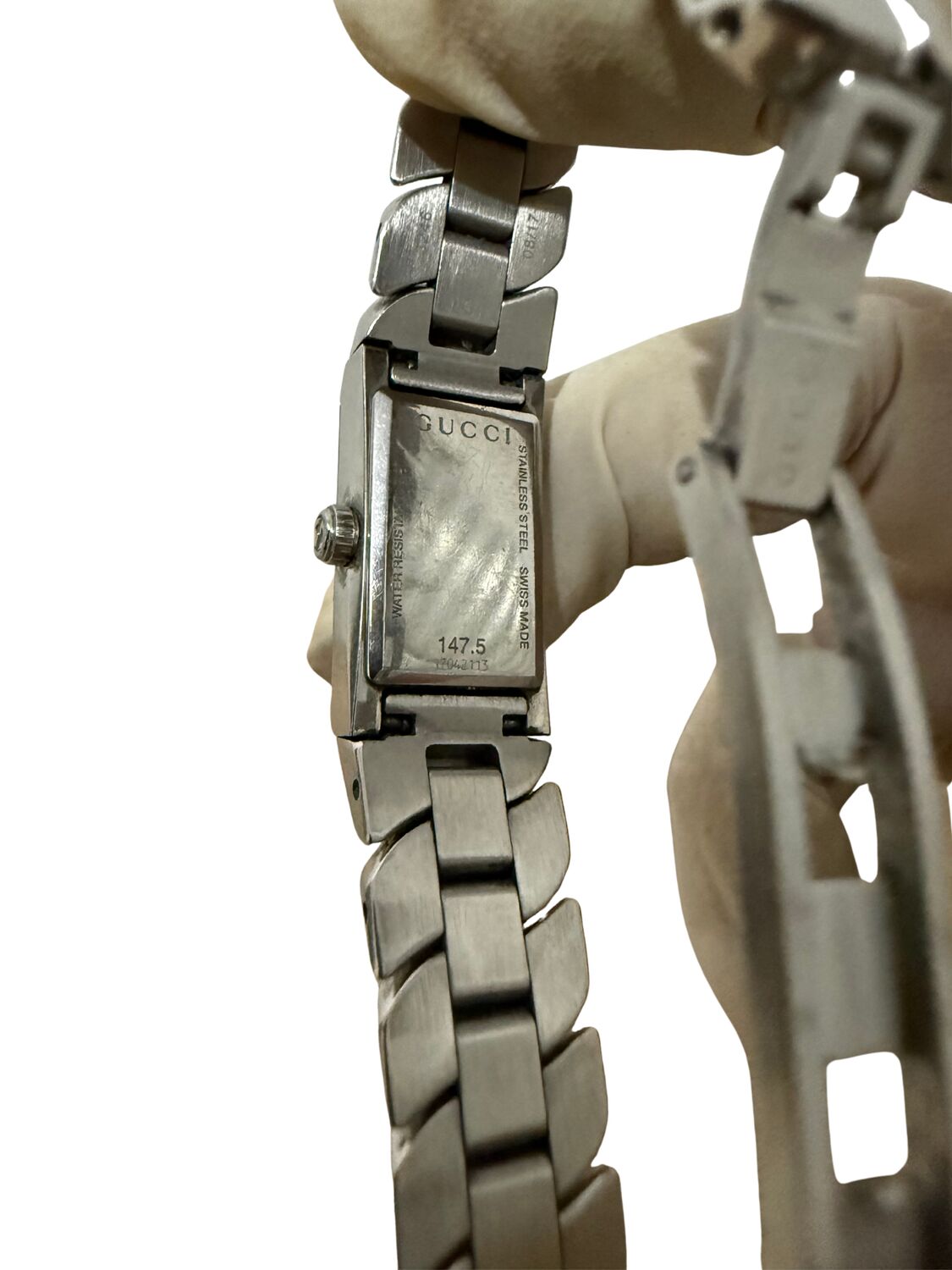 Relógio Gucci de axo inoxidável prata e logo no visor.