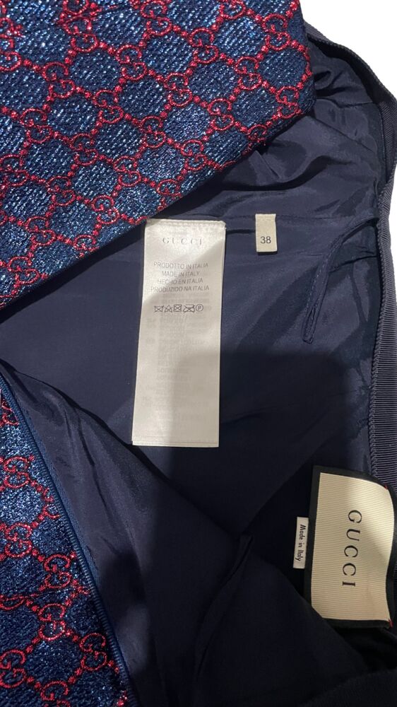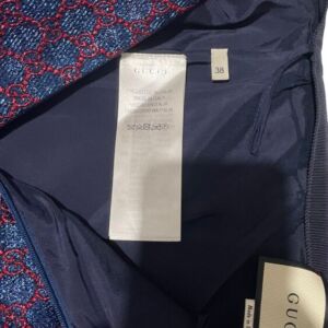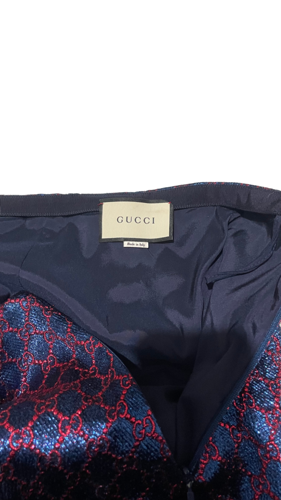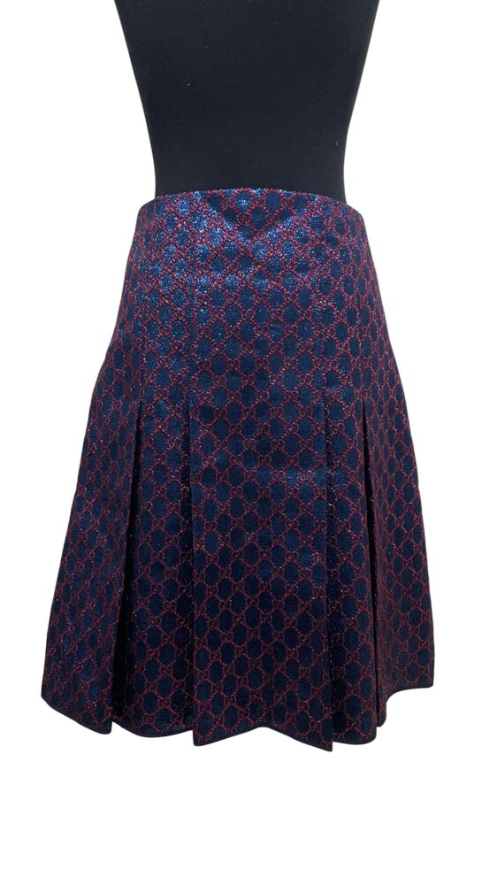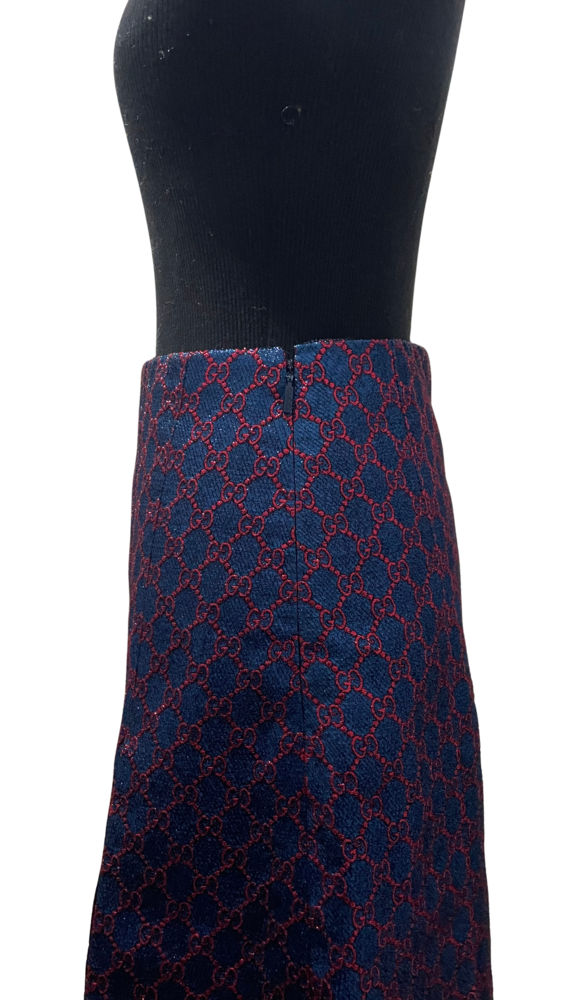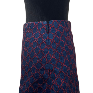 Saia Gucci em tecido azul marinho com monograma por toda a peça.
