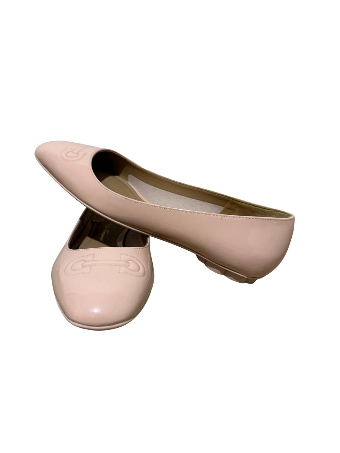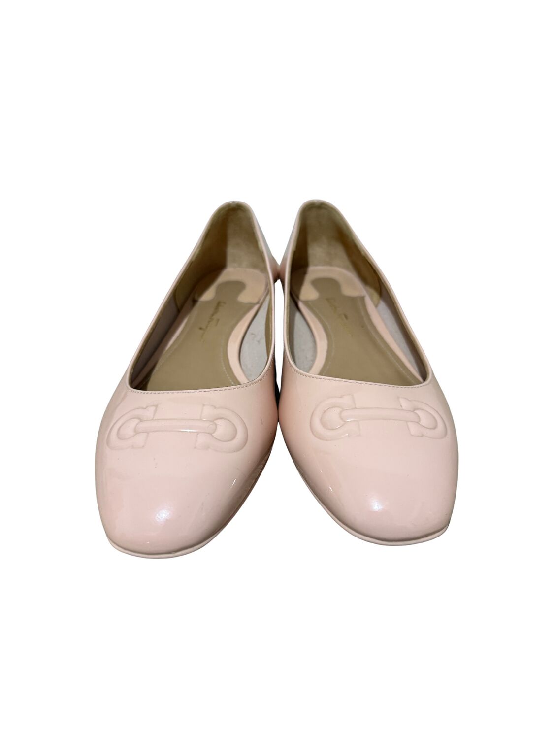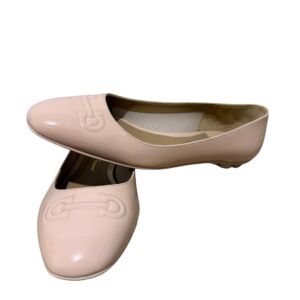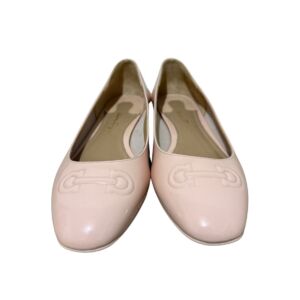 Sapatilha Salvatore Ferragamo em couro envernizado nude e logo frontal.