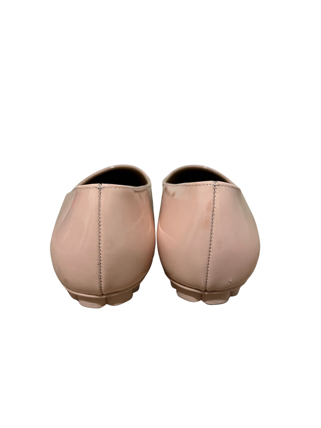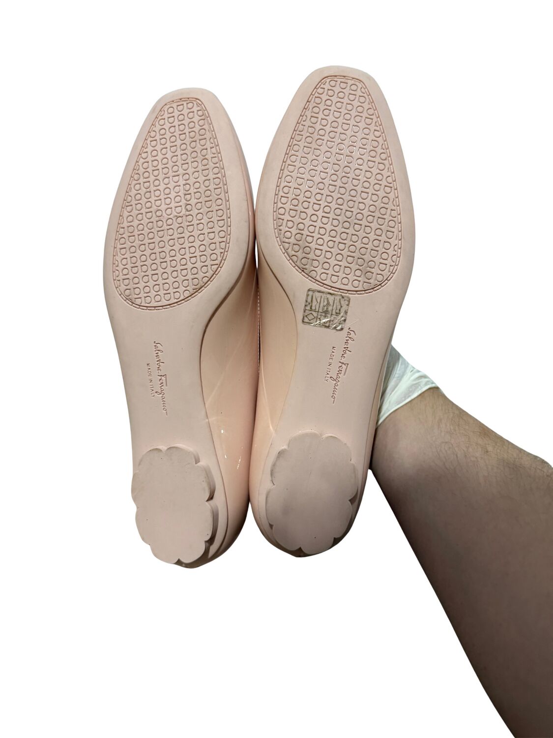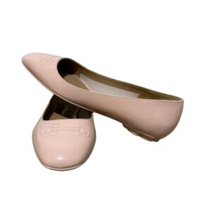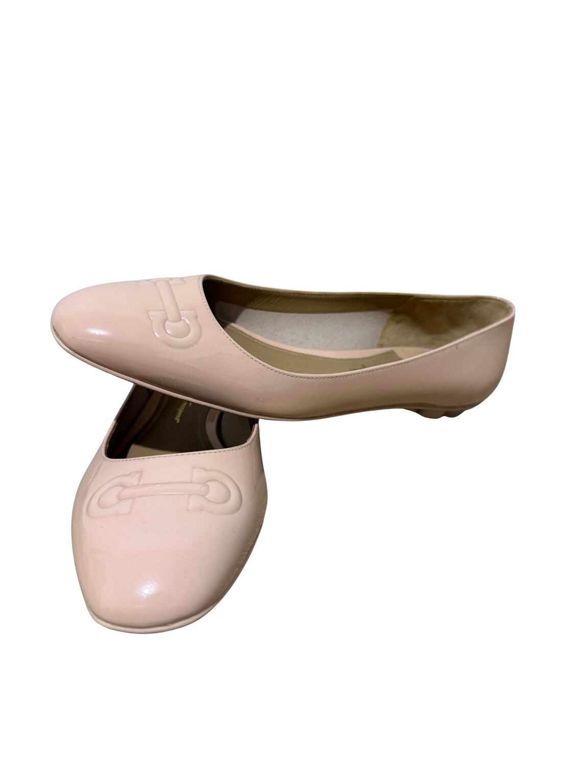Sapatilha Salvatore Ferragamo em couro envernizado nude e logo frontal.