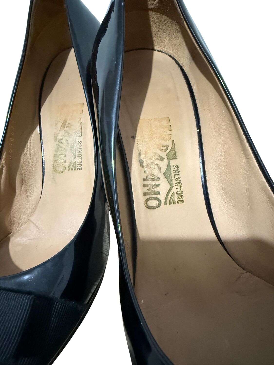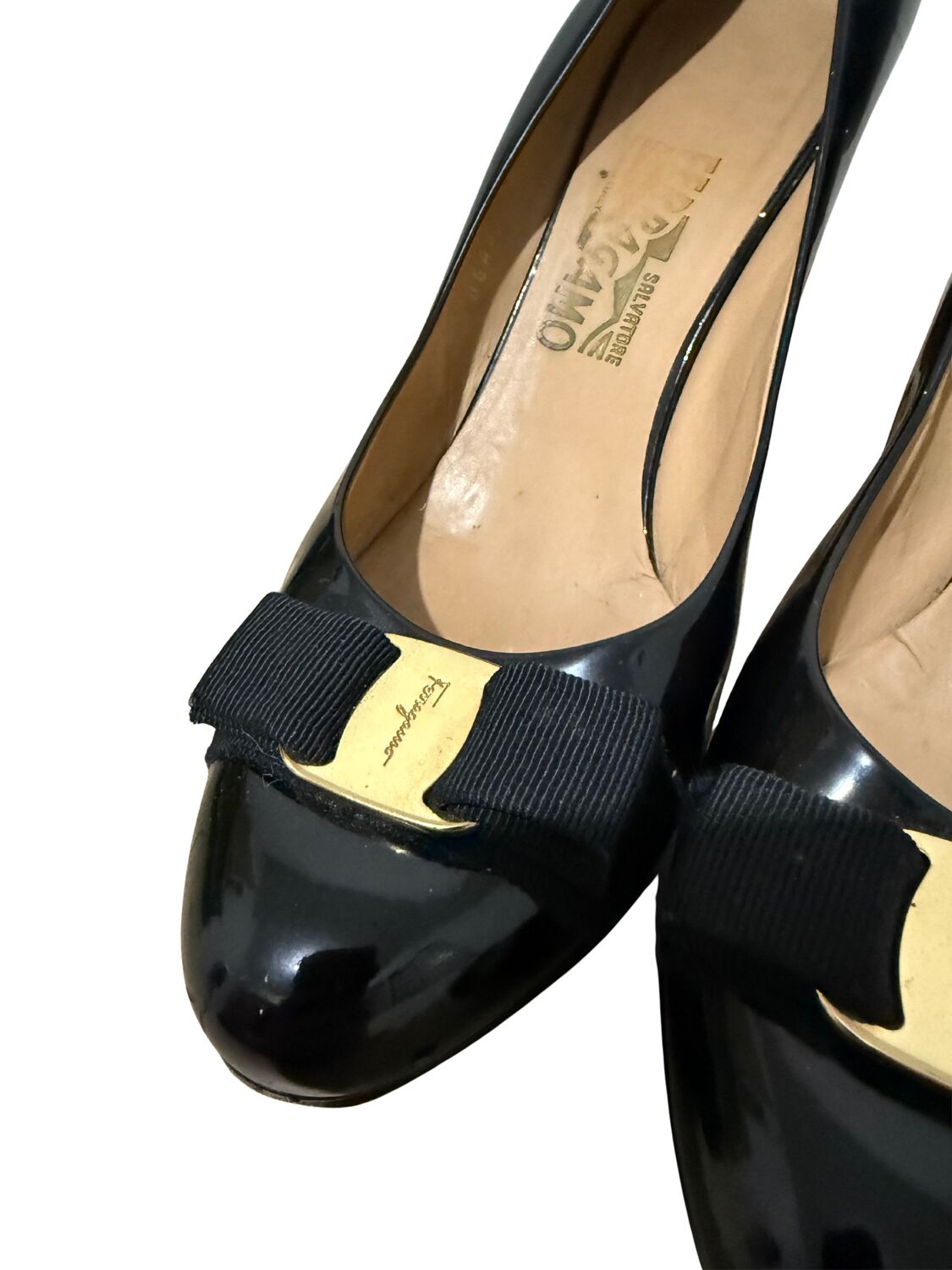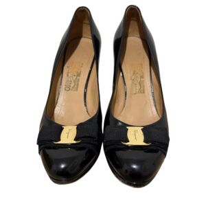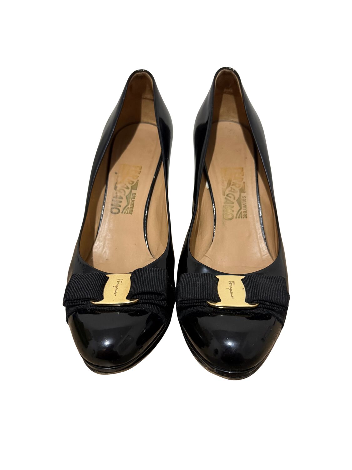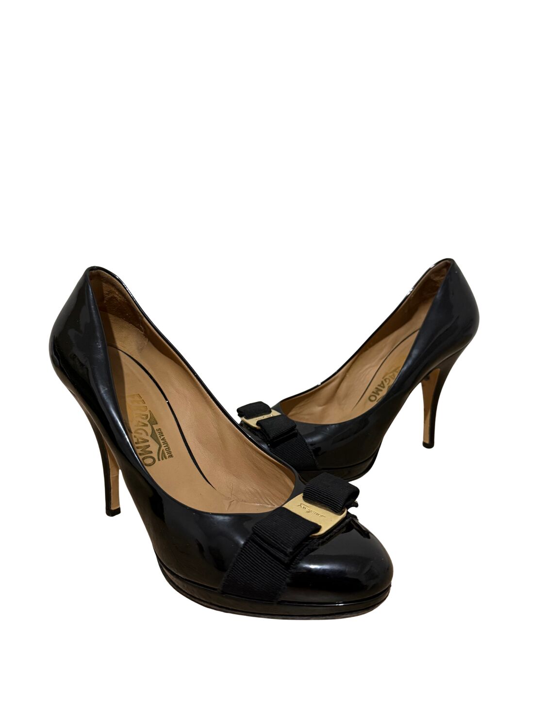 Scarpin em modelo clássico em couro envernizado preto e ferragens douradas.