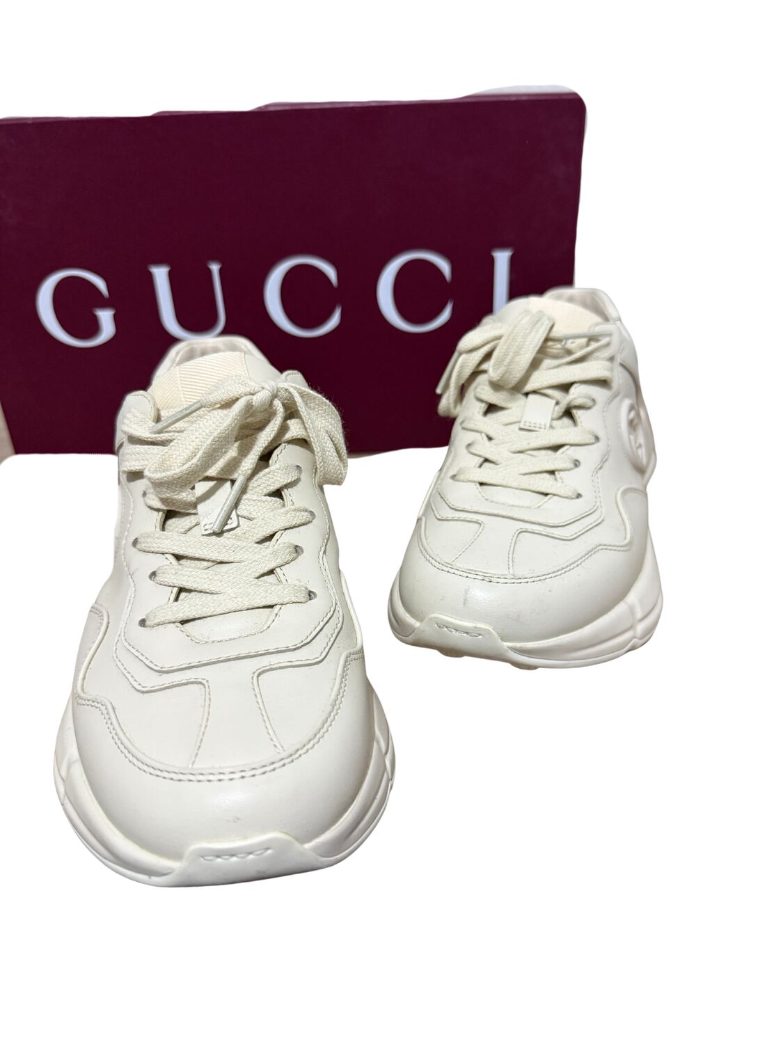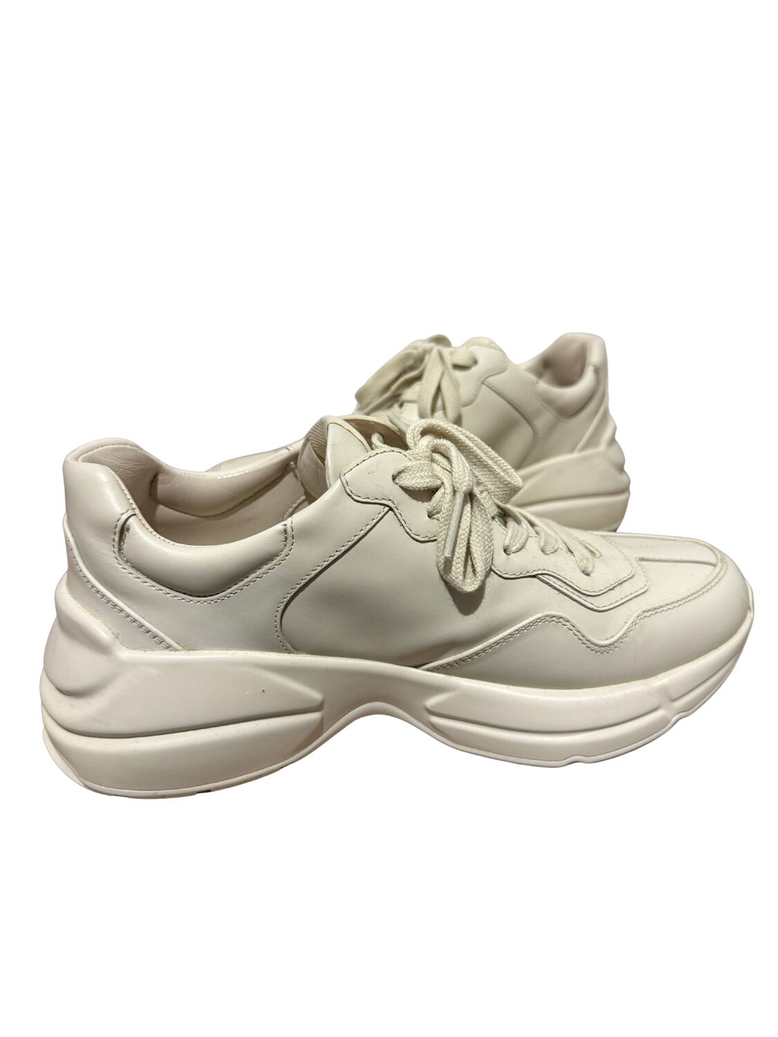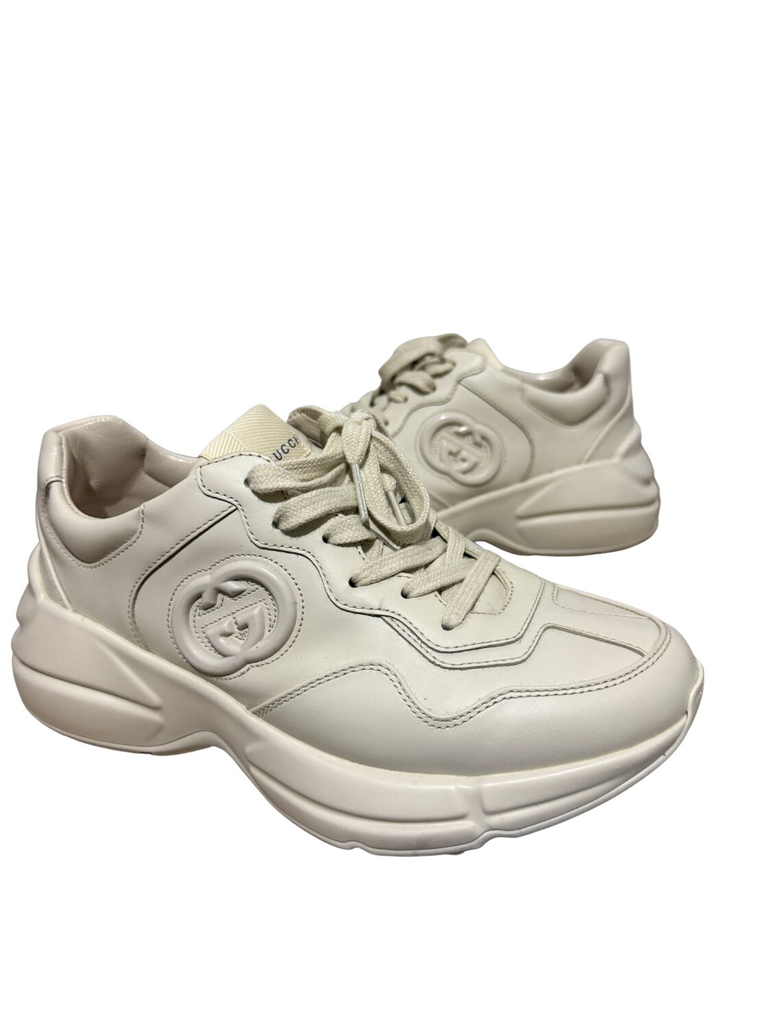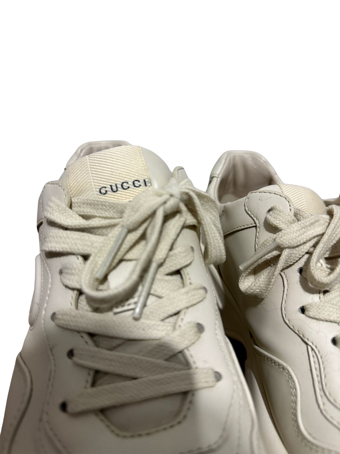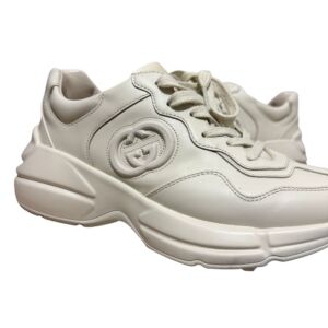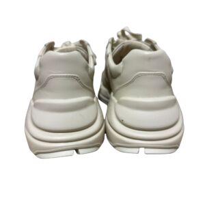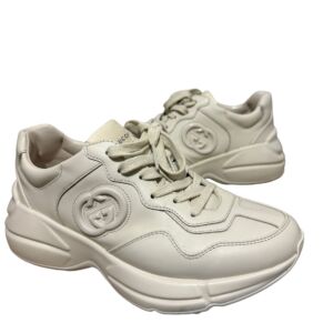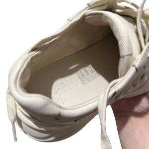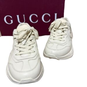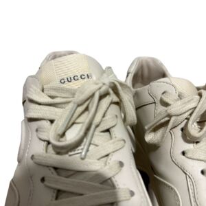 Tênis Gucci modelo Rhyton em couro bege e logo na lateral.