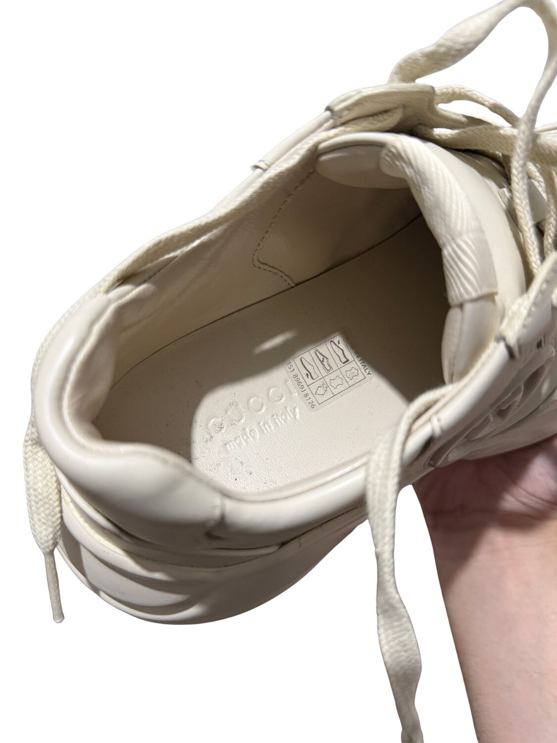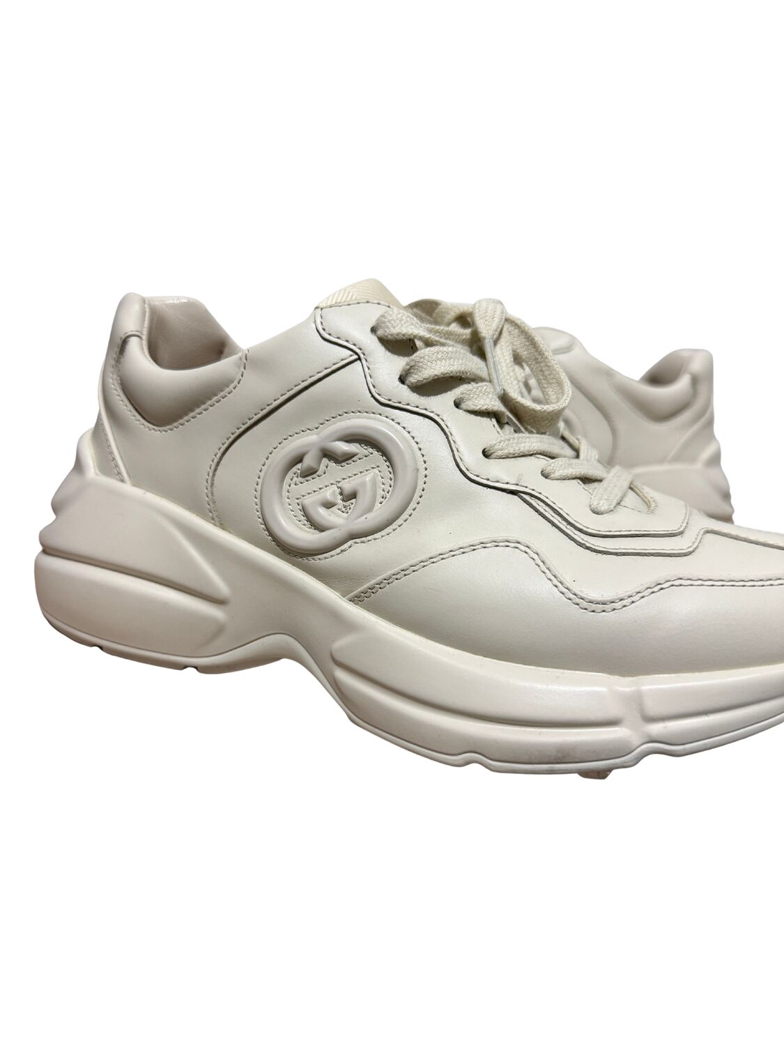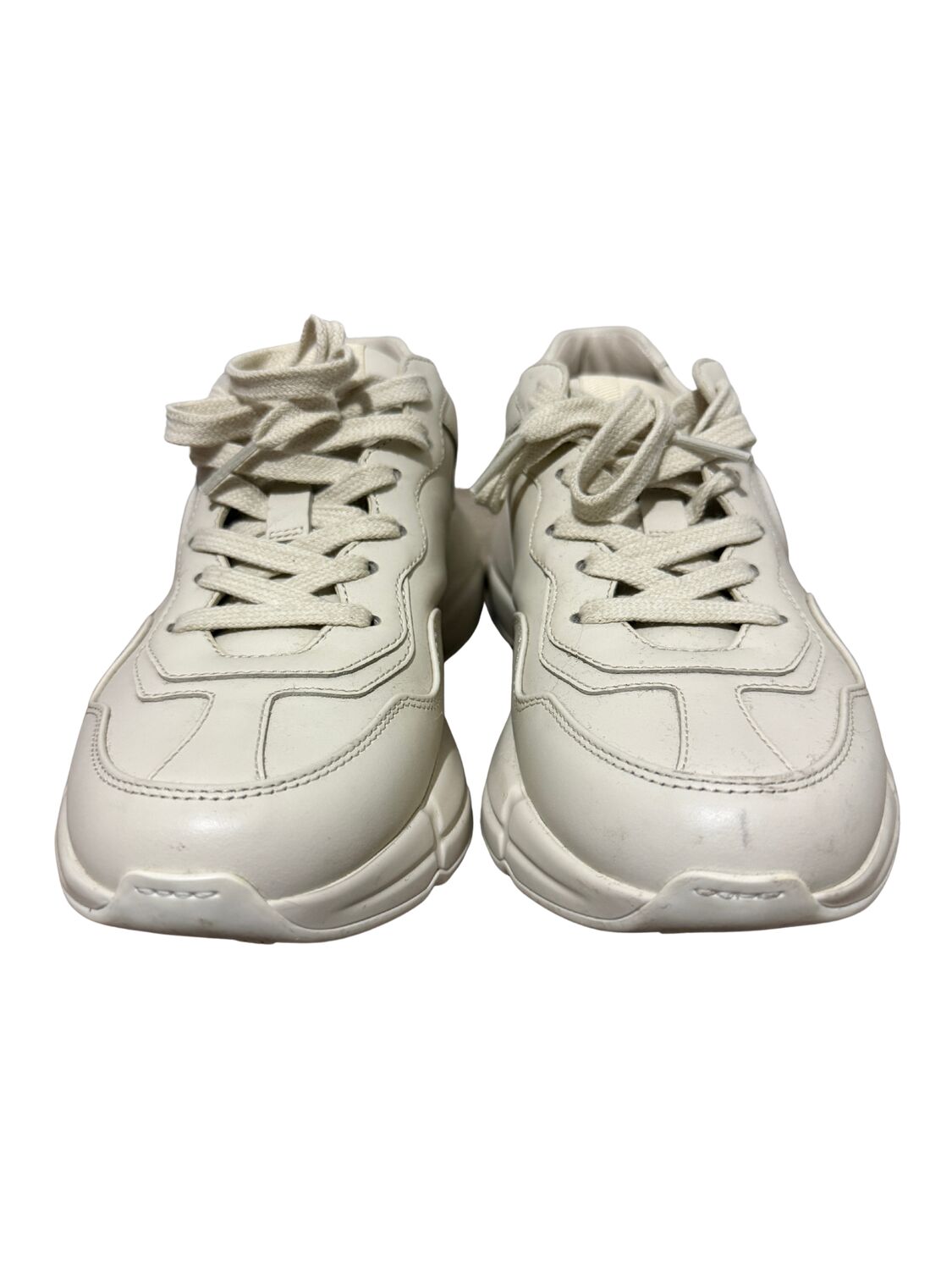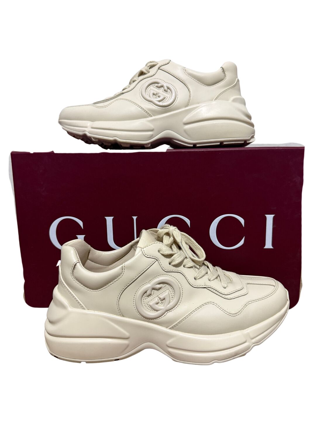 Tênis Gucci modelo Rhyton em couro bege e logo na lateral.