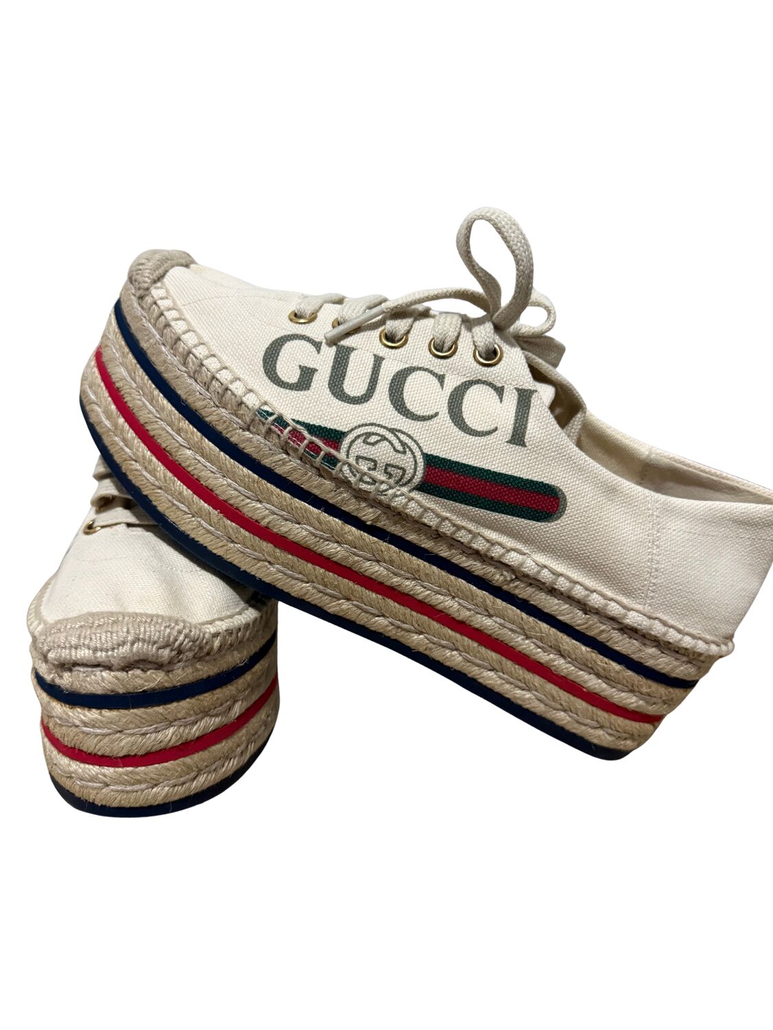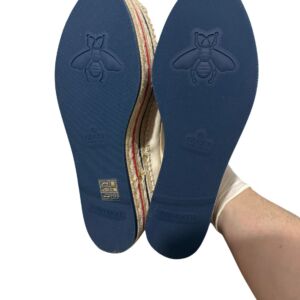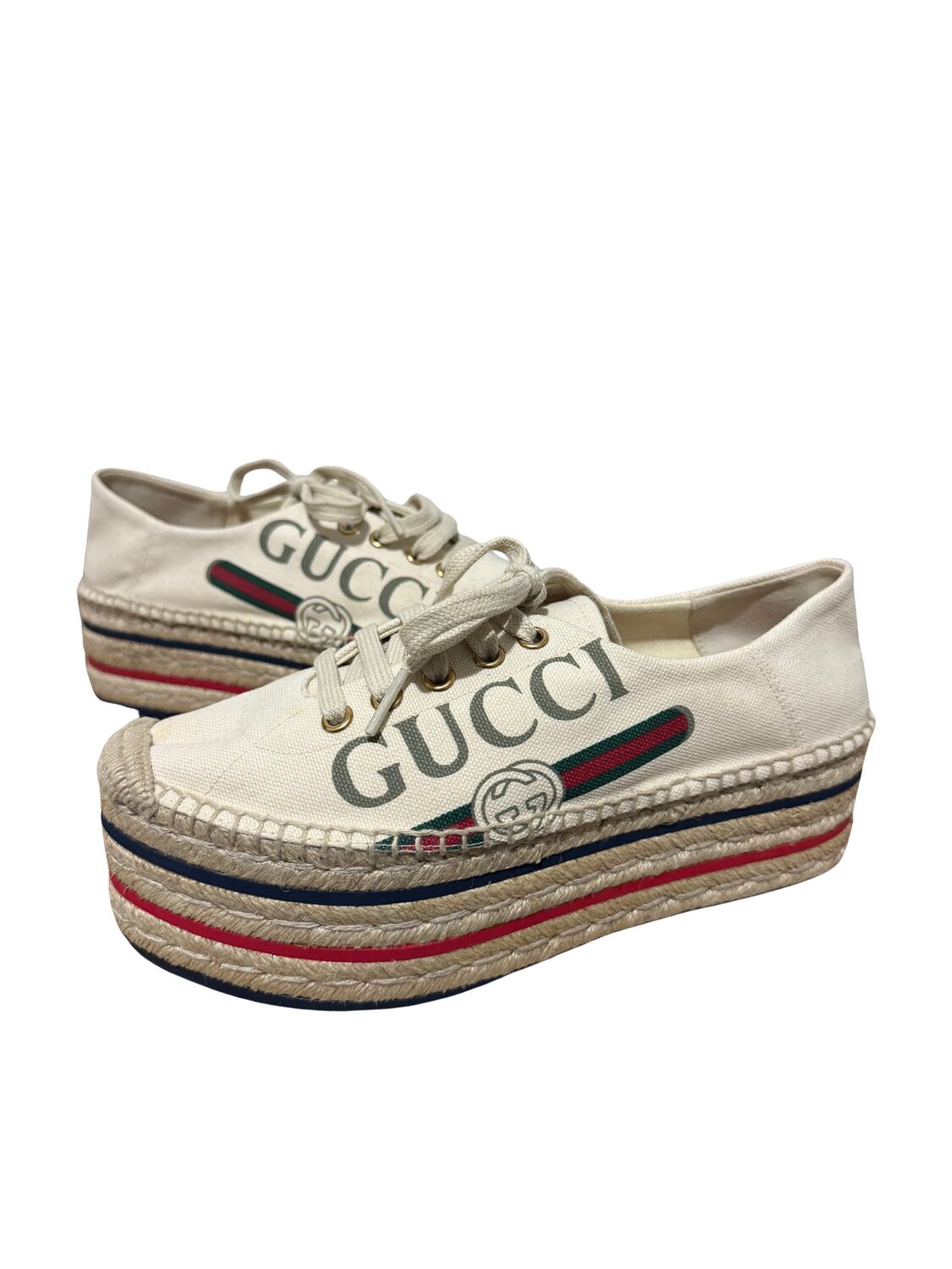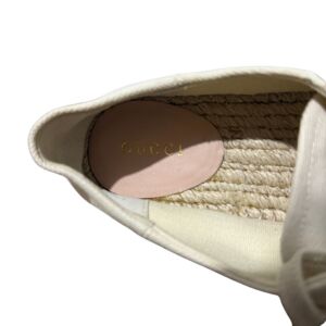 Tênis Gucci em tecido com logo lateral e sola plataforma em palha.