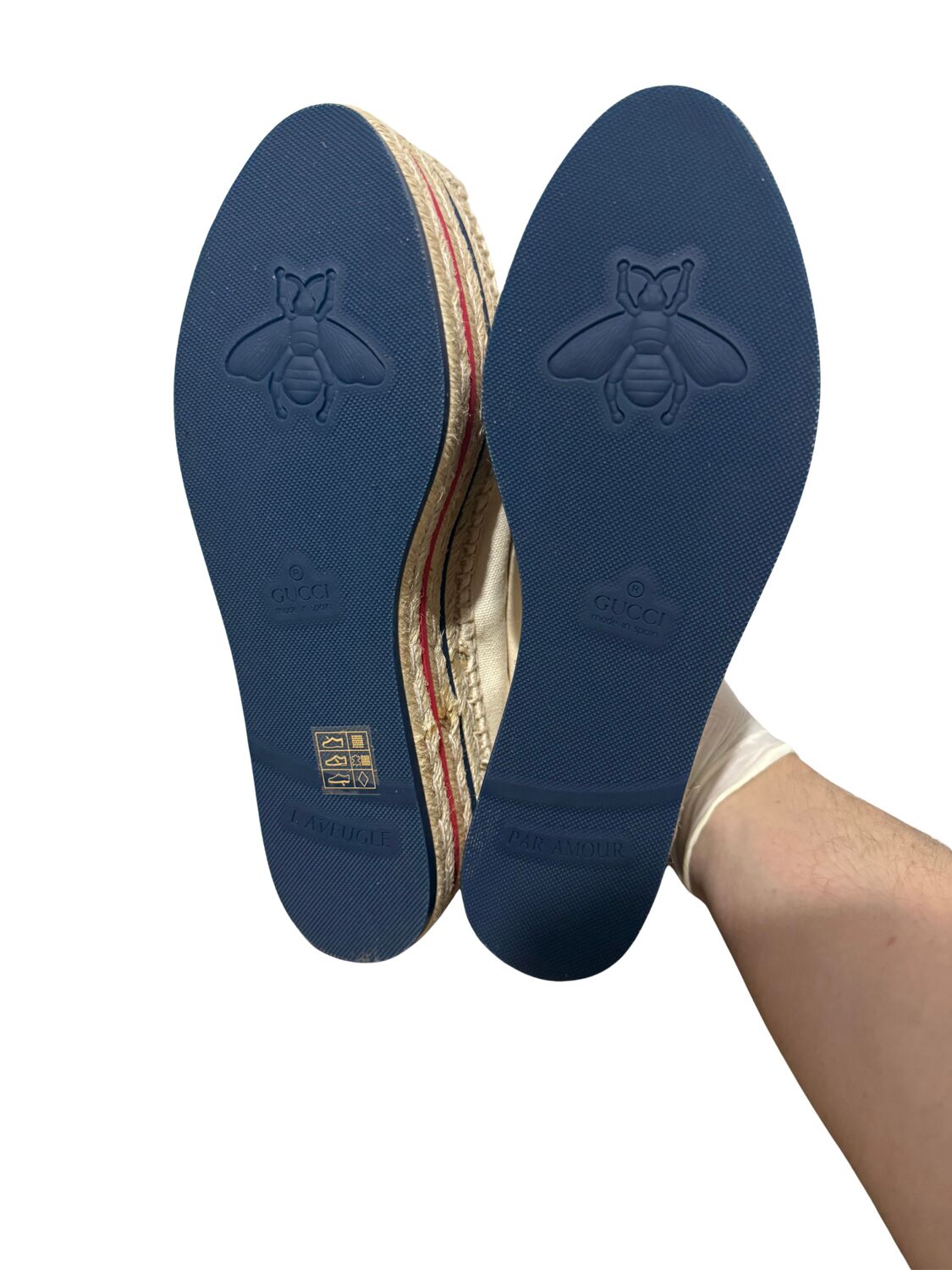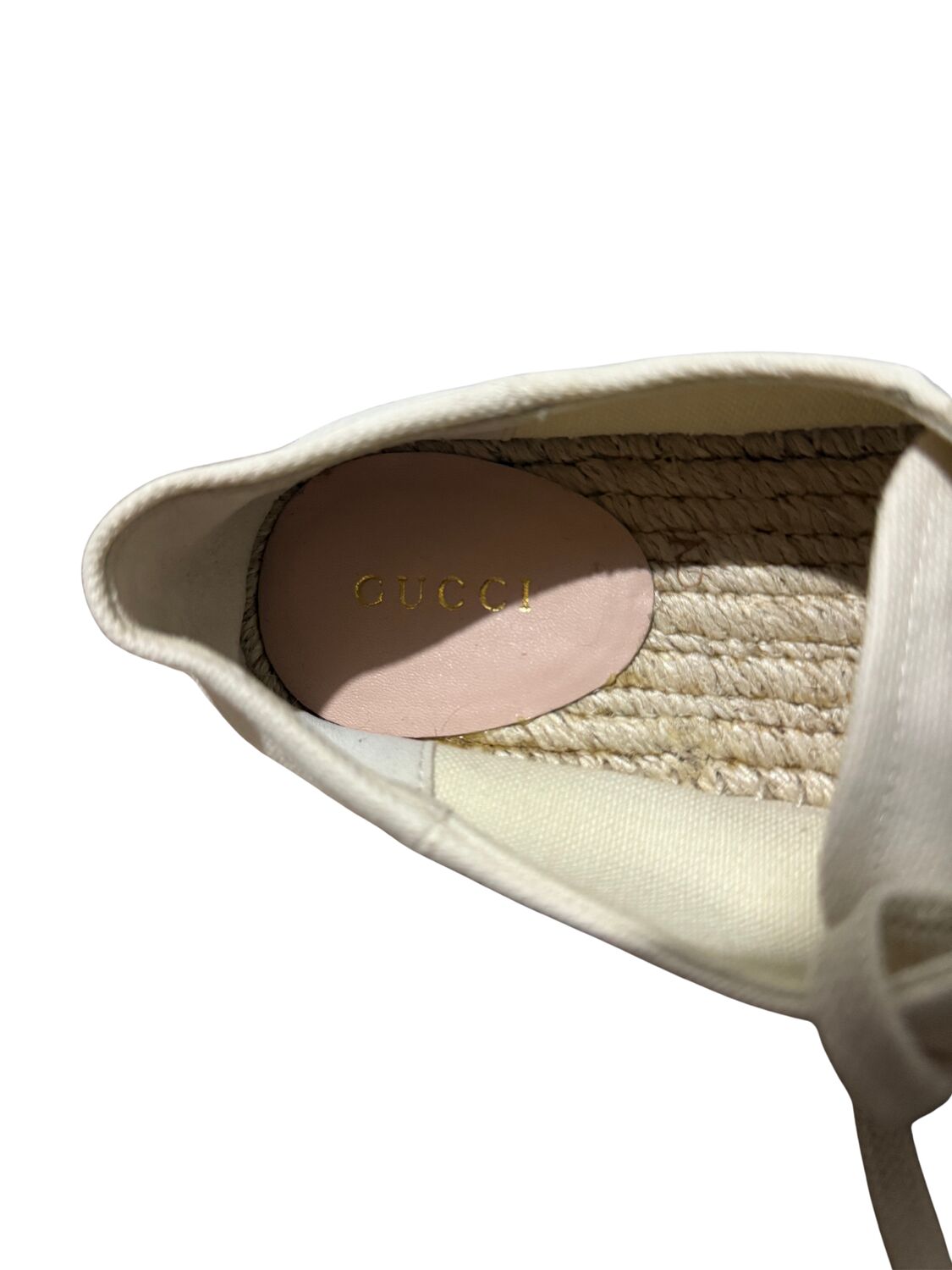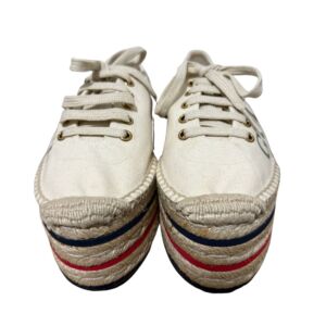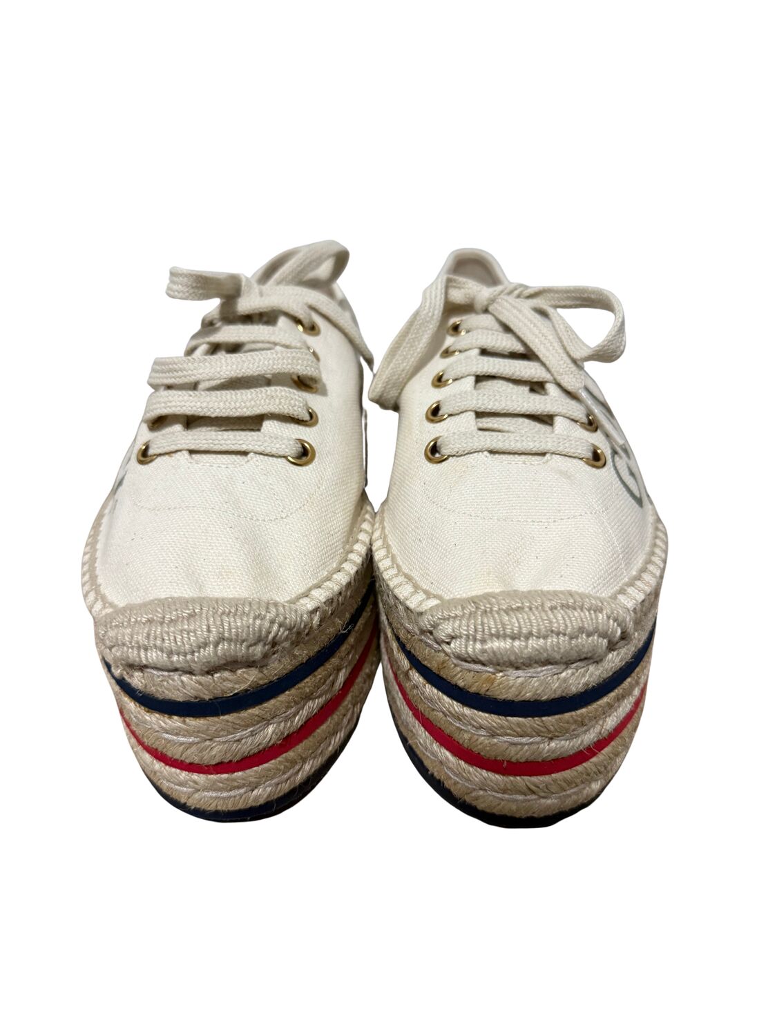 Tênis Gucci em tecido com logo lateral e sola plataforma em palha.